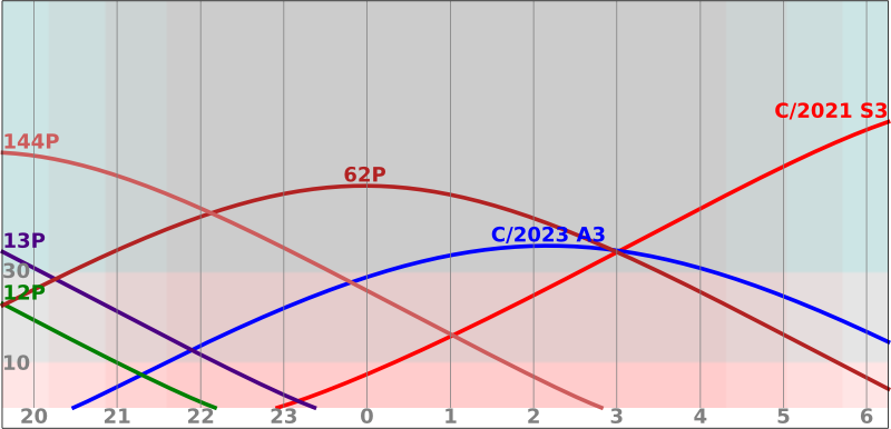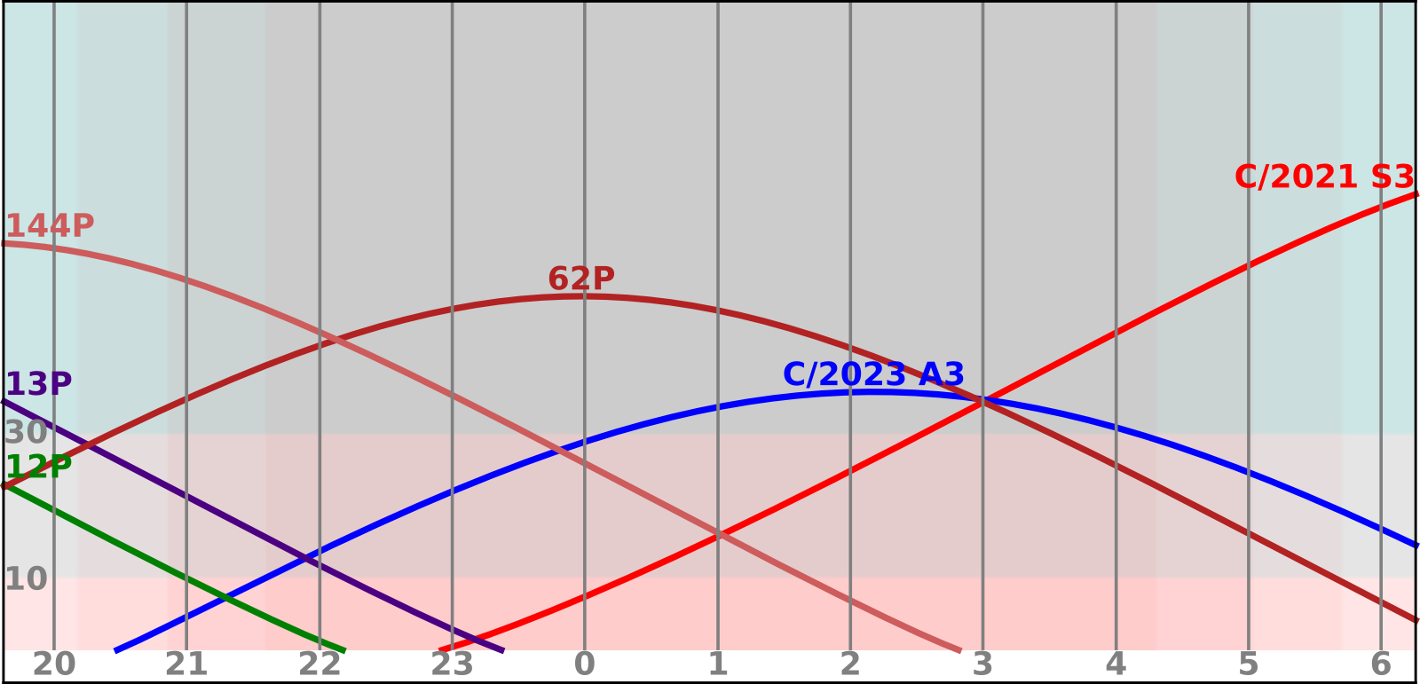 Večer se bude jižna soumrakové obloze u obzoru v souhvězdí Berana ztrácetpouhým okem slabě viditelná 12P/Pons-Brooks v maximujasnosti 4,5 mag. Kousek vedle ní, v Býku, bude zjasňující13P/Olbers s jasností kolem 10,5 mag. Silně zeslábne144P/Kushida, bude mít jen 11,5 mag a nalezneme ji vBlížencích. V Raku stále nalezneme29P/Schwassmann-Wachmann.Okolo půlnoci budeme moci v Panně pozorovat 62P/Tsuchinshan,bude už ale slabší 12 mag. Ve stejném souhvězdí nalezneme izjasňující C/2023 A3 (Tsuchinshan-ATLAS), lehce slabší 11mag. Vysoko na obloze poletí z Lištičky do Labutě C/2021 S3(PANSTARRS), jejíž jasnost již lehce zeslábne pod 9 mag.