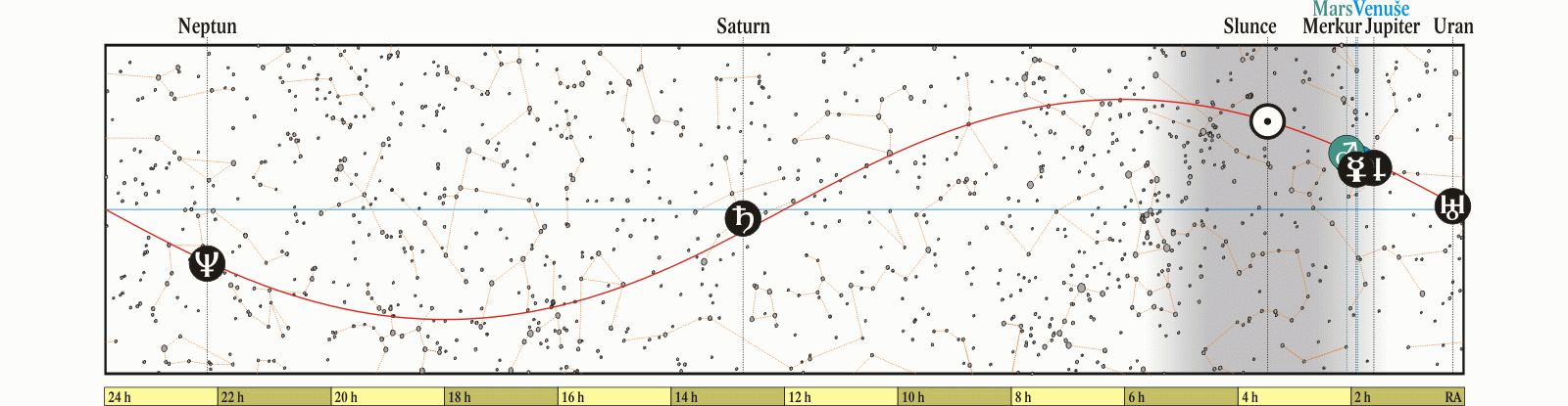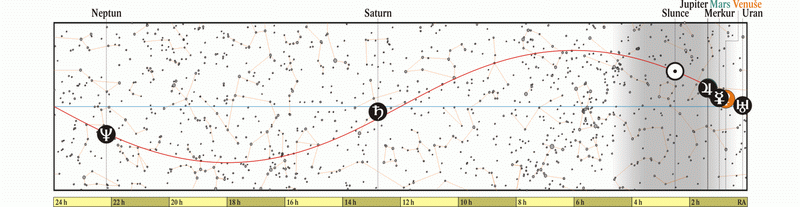 Konjunkce Venuše a Jupiteru. Zajímavý úkaz pro malé dalekohledy: úhlová vzdálenost obou těles bude pouhých 34´ a v dalekohledu s malým zvětšením by obě tělesa měla být společně patrná. |