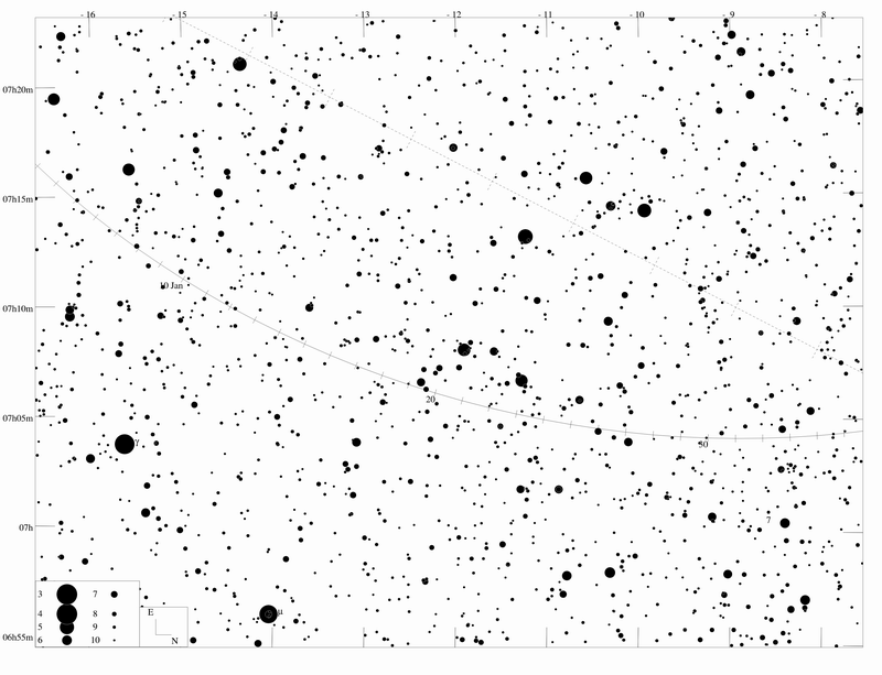 Mimořádně příznivý návrat zažila v roce 2010 krátkoperiodická kometa 103P/Hartley. Jako relativně jasná bude pozorovatelná ještě v lednu 2011. Naleznete ji při deklinaci kolem -10° nízko nad jižním obzorem v souhvězdí Velkého psa (CMa). Bude rychle slábnout a počátkem února již bude slabší 12. mag.