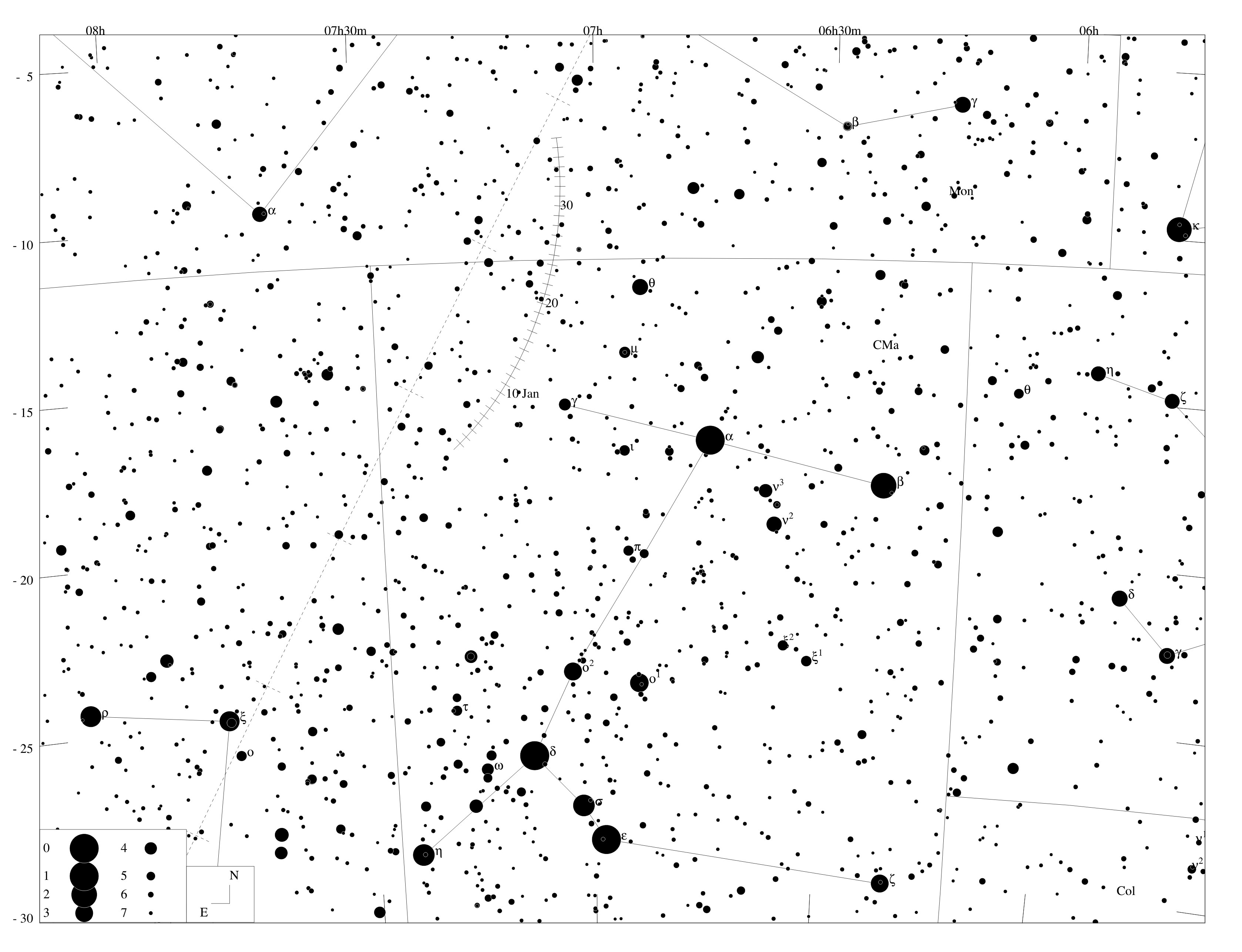 E ~ elongace; m ~ jasnost; A ~ azimut; h ~ výška |
