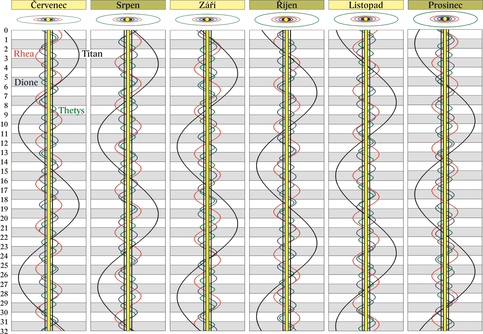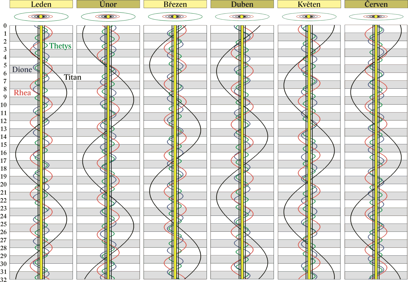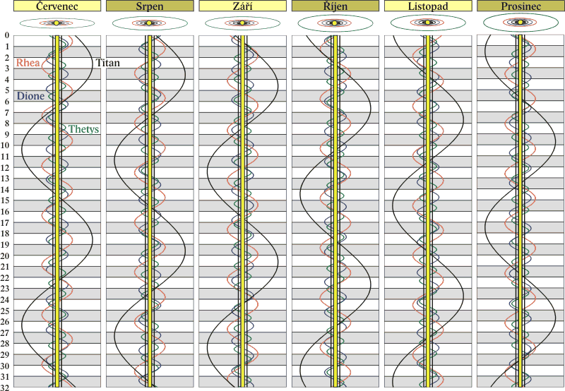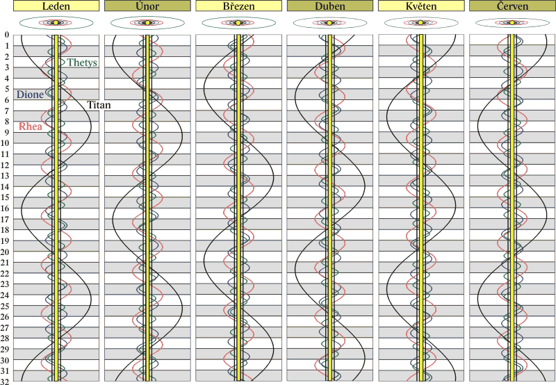 Grafy poloh čtyř největších měsíců Saturna.