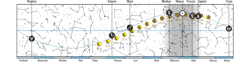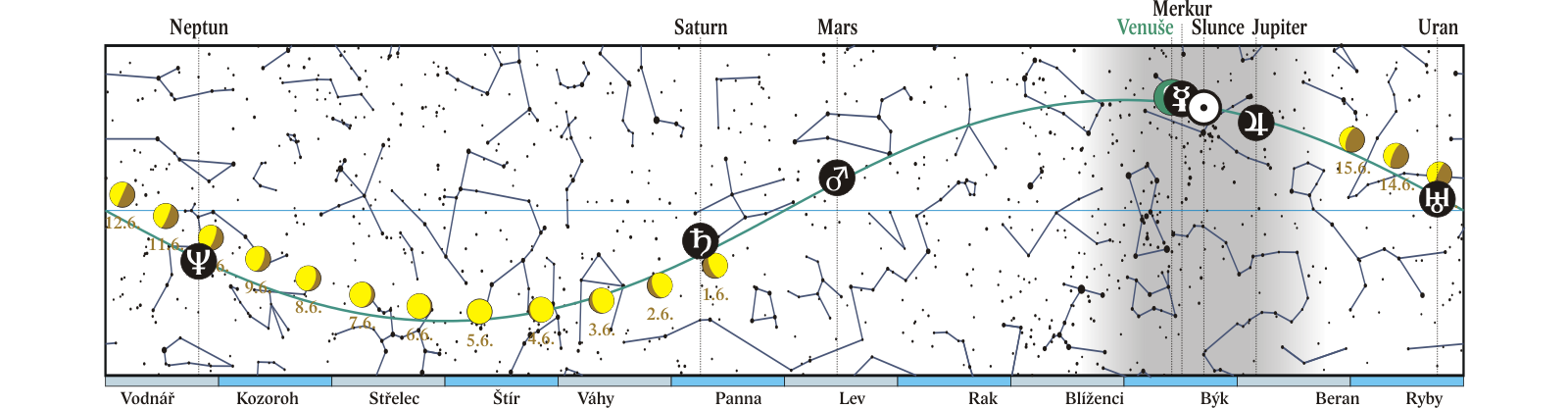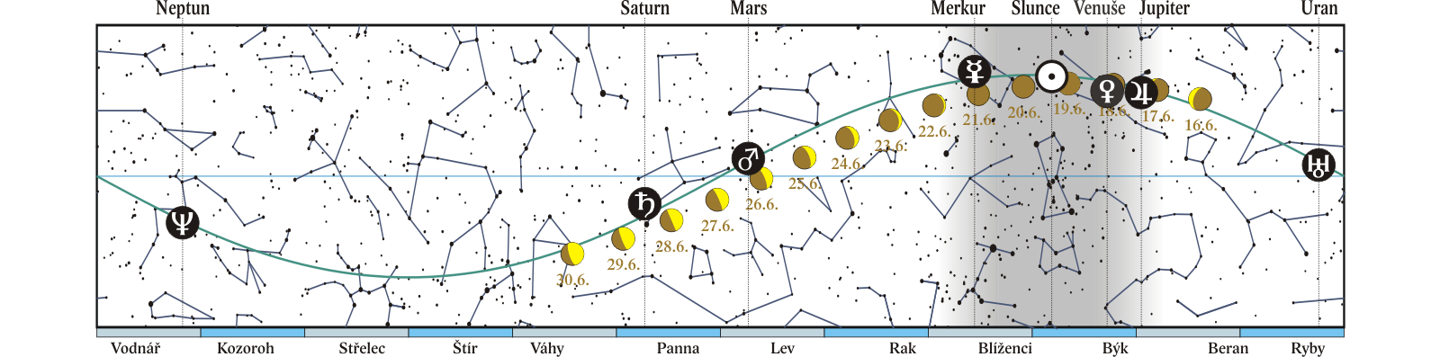 Měsíc v konjunkci s Marsem (Měsíc 5,8° jižně; seskupení Měsíce, Marsu, Saturnu a Spiky (alfa Vir) pozorovatelné 25. – 28. 6. večer na západě a jihozápadě) |