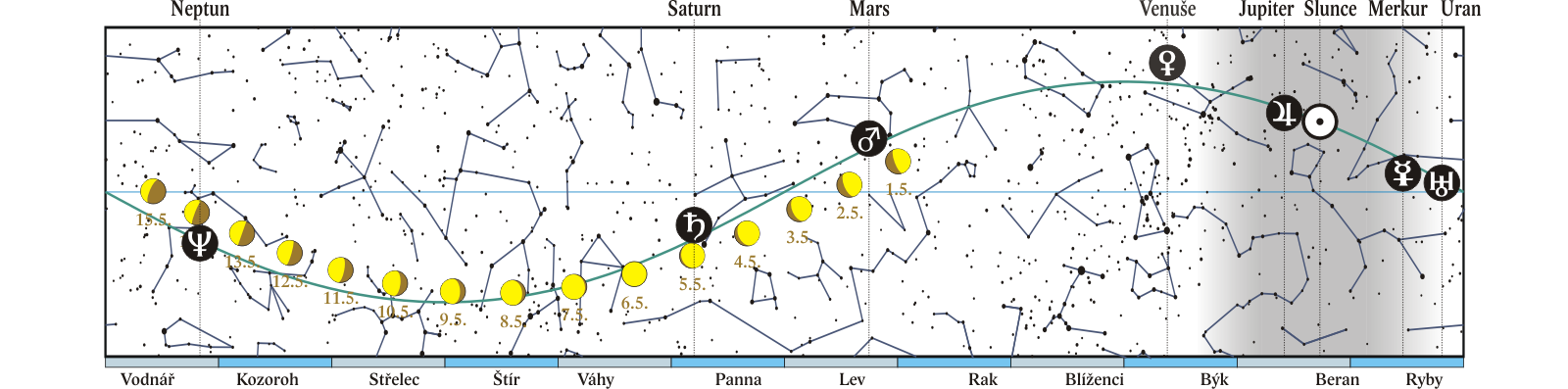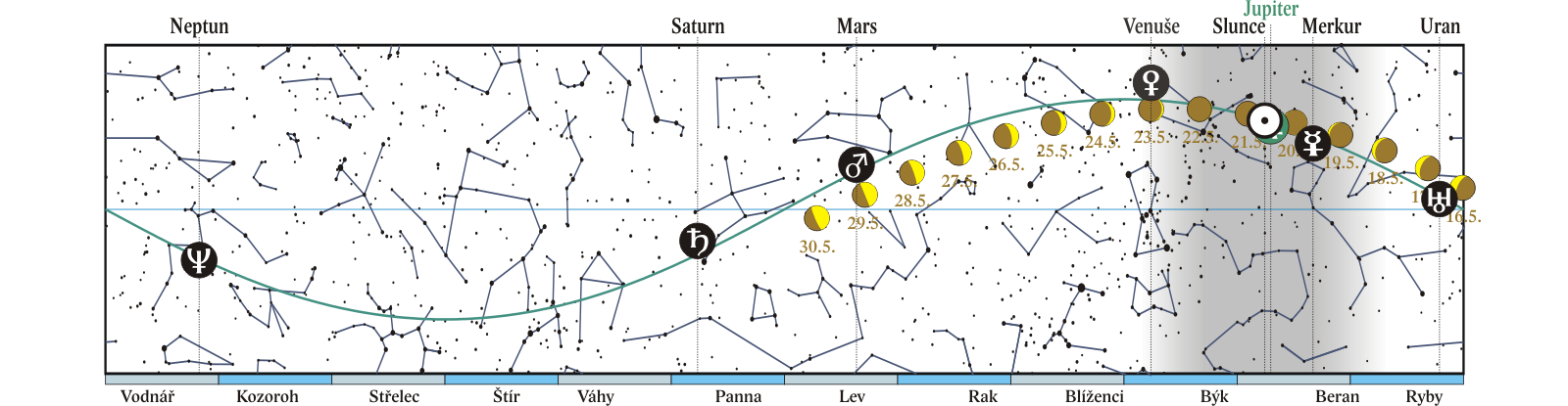 Měsíc v konjunkci se Saturnem (Měsíc 6,7° jižně; 5. 5. ráno seskupení Měsíce, Saturnu a Spiky (alfa Vir)) |