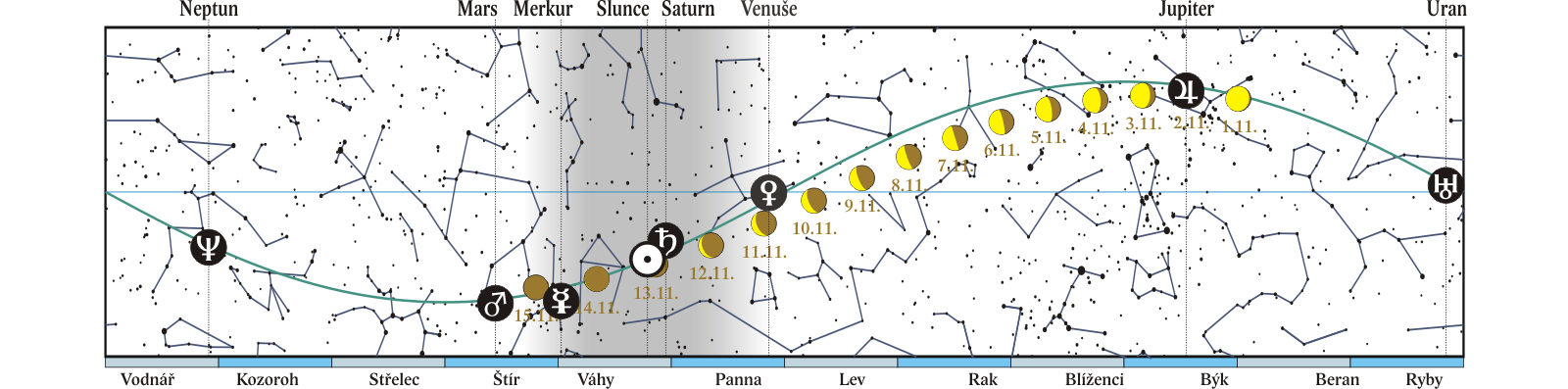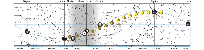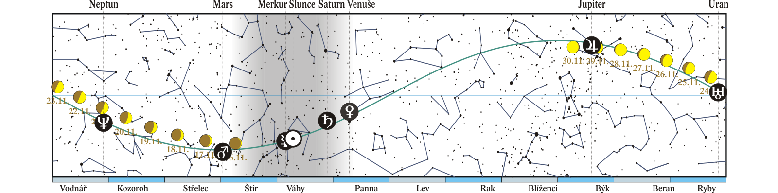Měsíc v konjunkci s Venuší (Měsíc 6,0° jižně; 11. a 12. 11. seskupení Měsíce, Venuše, Spiky (alfa Vir) a Saturnu ráno na jihovýchodě) |