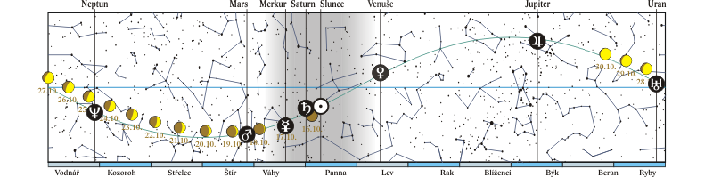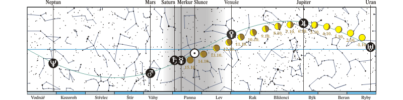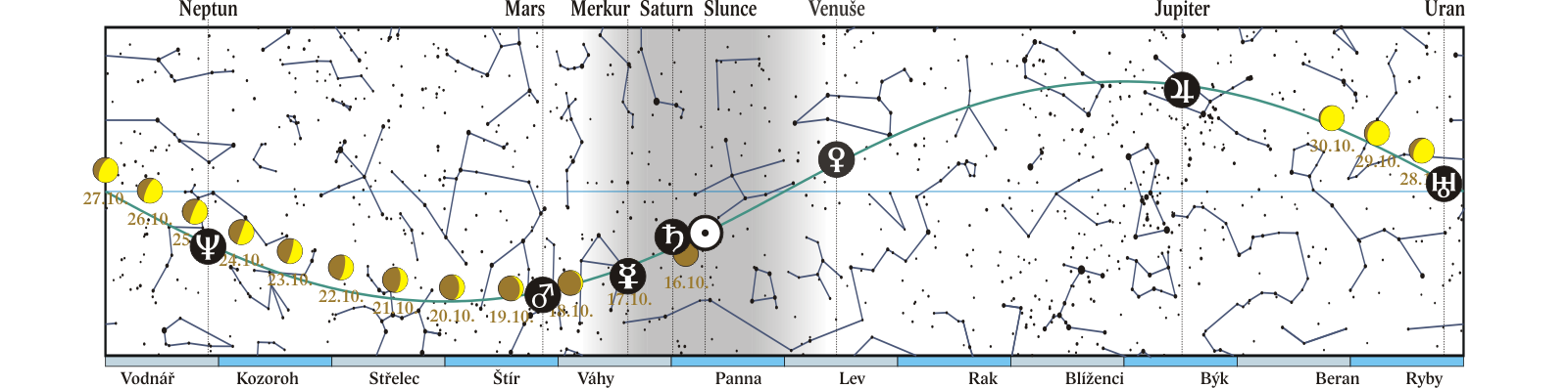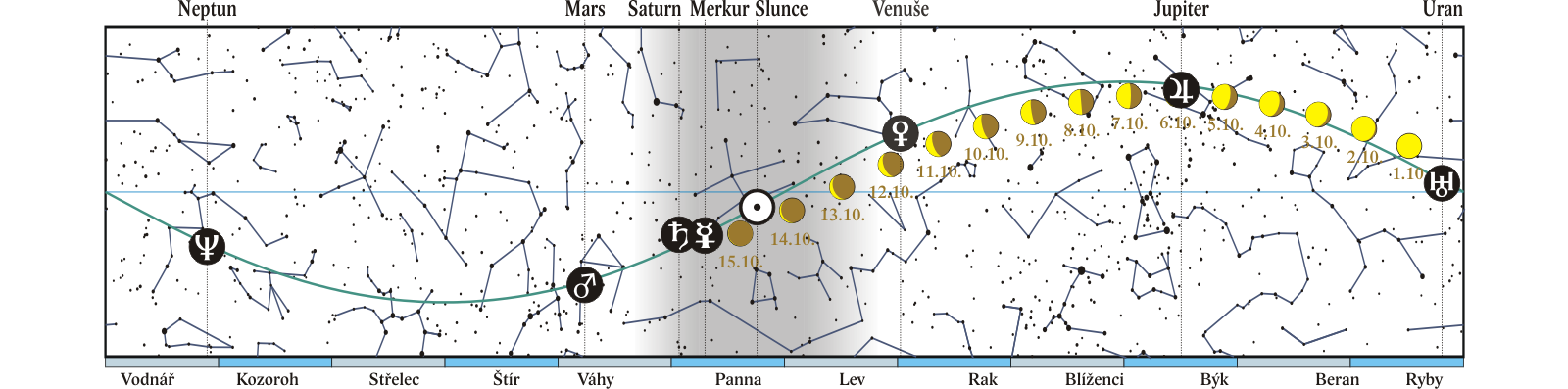 Měsíc v konjunkci s Venuší (Měsíc 6,8° jižně; Venuše v blízkosti Měsíce pozorovatelná 12. a 13. 10. ráno na východě) |