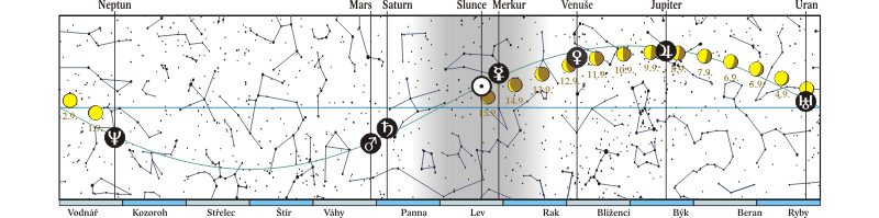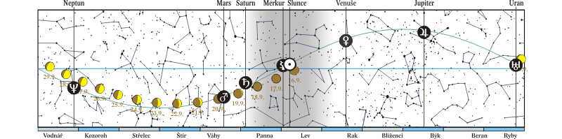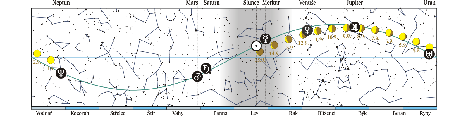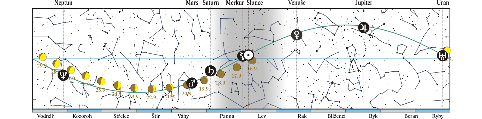 Měsíc v konjunkci s Jupiterem (Měsíc 1,4° jižně; Jupiter v blízkosti Měsíce pozorovatelný 8. a 9. 9.) |