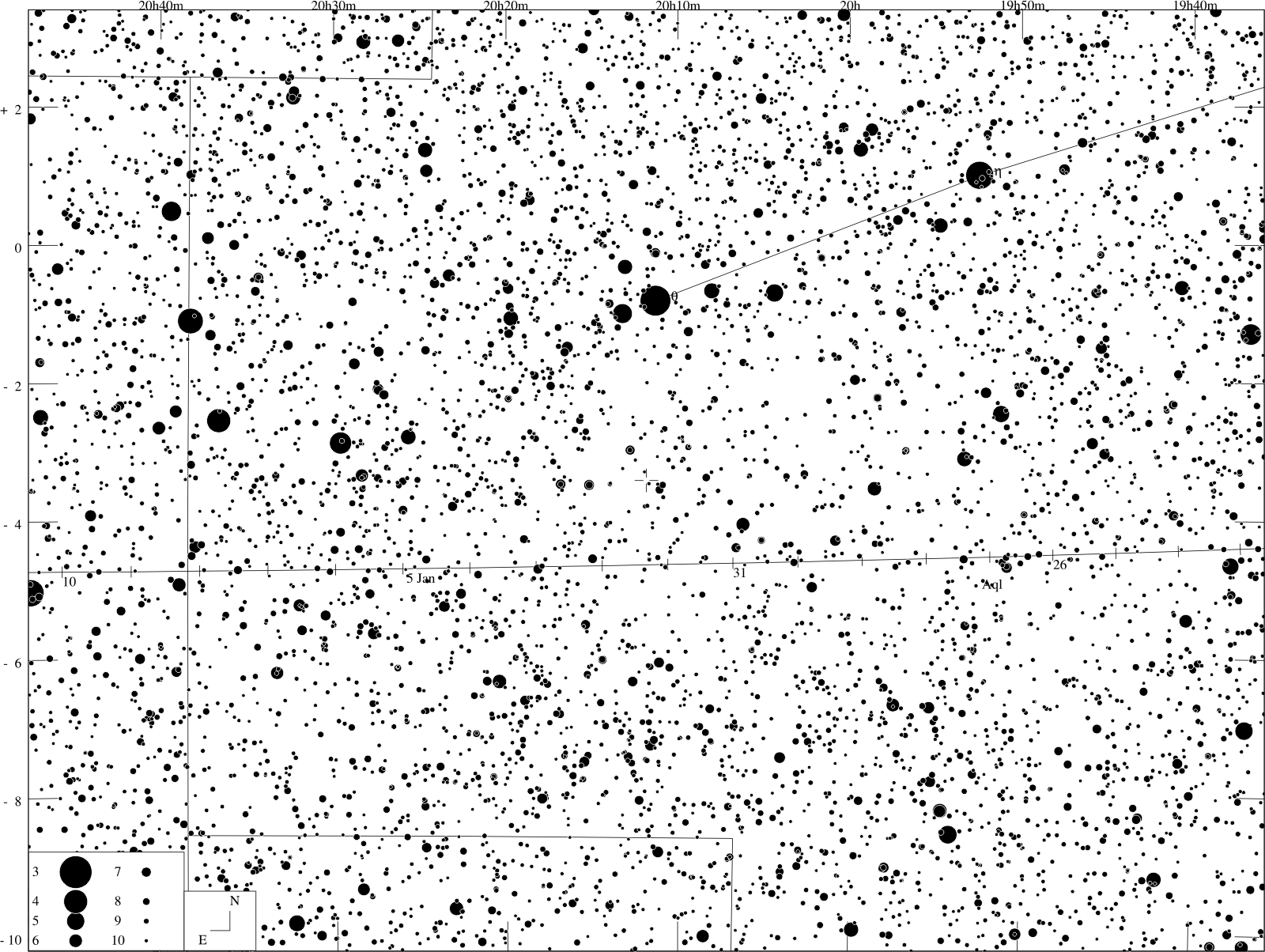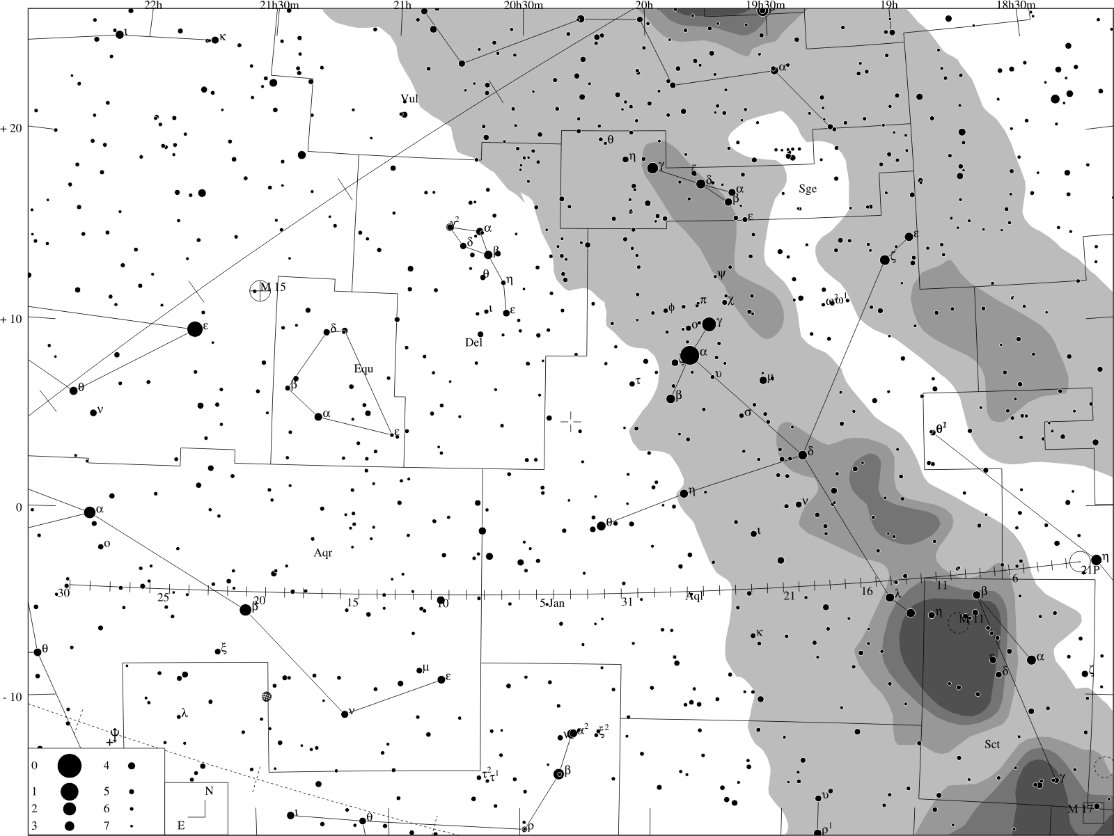 E ~ elongace; m ~ jasnost; A ~ azimut; h ~ výška |