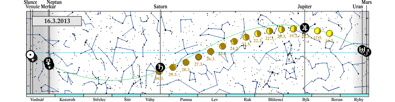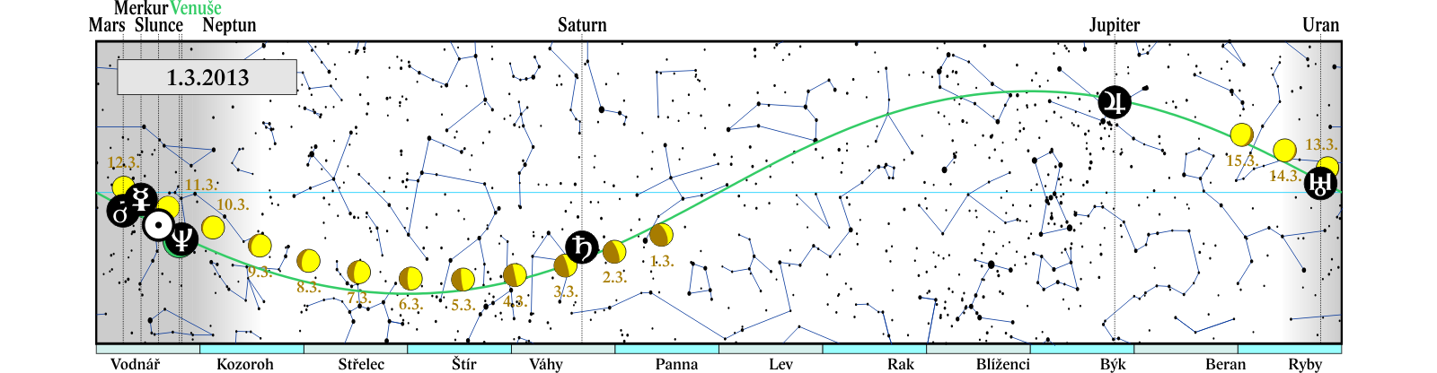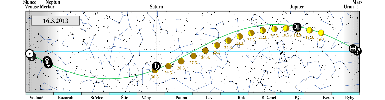 Měsíc v konjunkci s Jupiterem (Měsíc 2,3° jižně; Jupiter v blízkosti Měsíce pozorovatelný 17. a 18. 3. večer v souhvězdí Býka poblíž Aldebaranu a Plejád, nedaleko se nachází Vesta a Ceres, které lze vyhledat dalekohledem) |