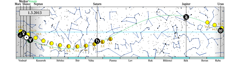 Měsíc v konjunkci se Saturnem (Měsíc 3,8° jižně; Saturn v blízkosti Měsíce pozorovatelný 2. a 3. 3. po půlnoci) |