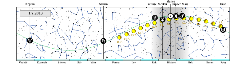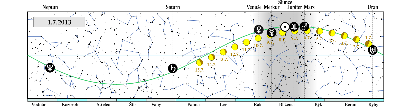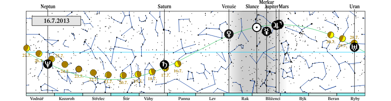 Měsíc v konjunkci se Saturnem (Měsíc 4,1° jižně; Saturn v blízkosti Měsíce pozorovatelný 16. 7. večer) |