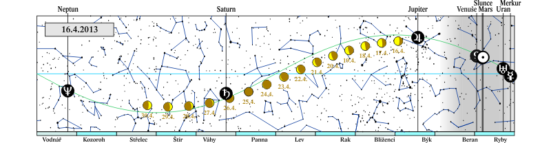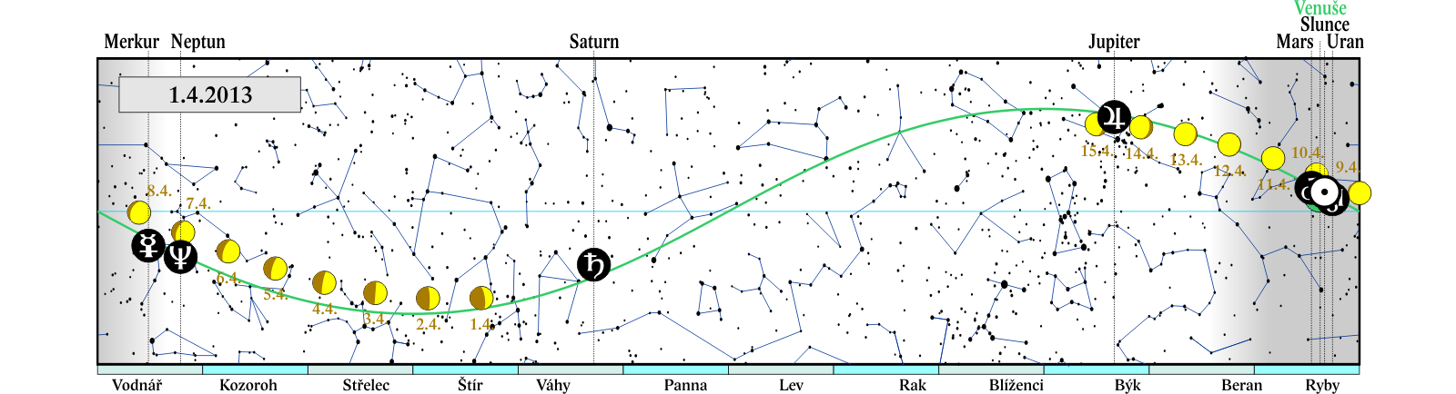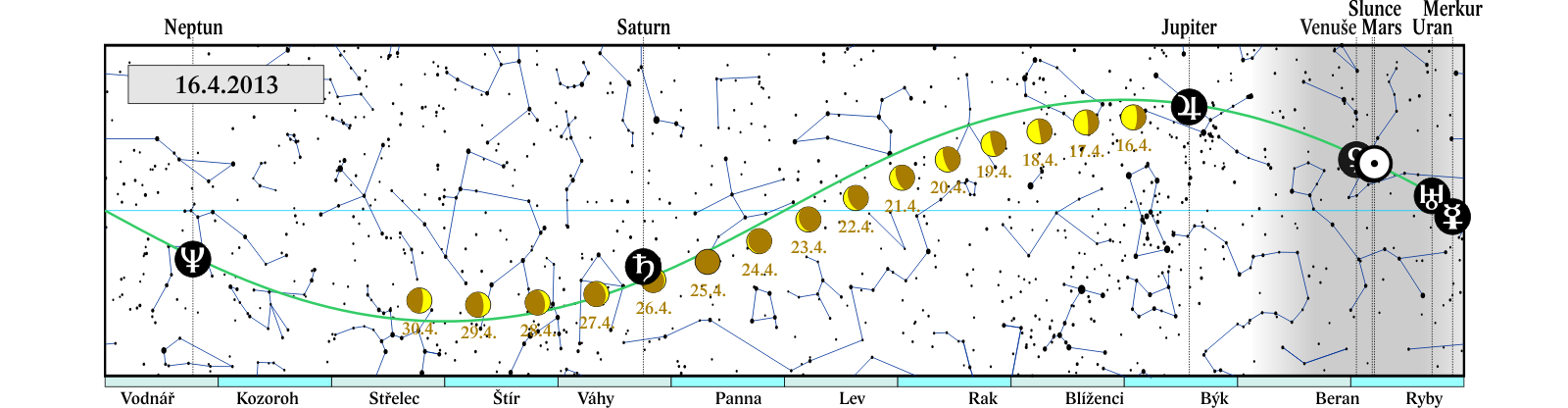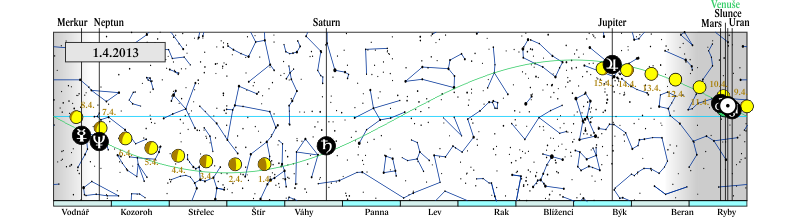 Měsíc v konjunkci s Jupiterem (Měsíc 2,7° jižně; úkaz pozorovatelný večer nad západním obzorem blízko Aldebaranu v souhvězdí Býka) |