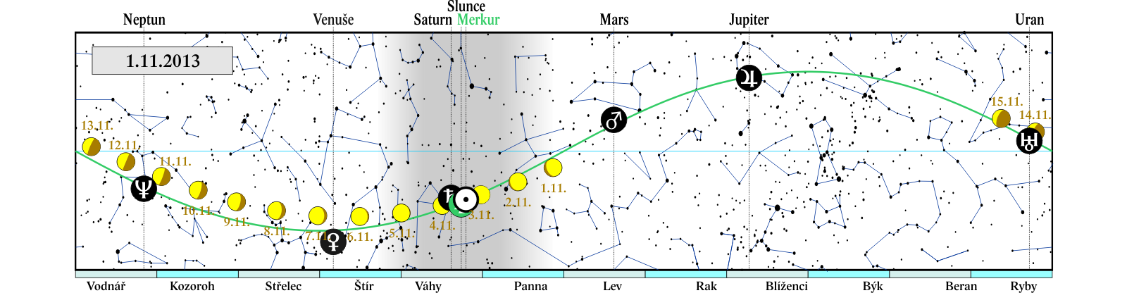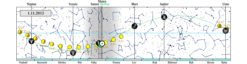 Merkur v konjunkci se Saturnem (Merkur 0,31° jižně; krátce po konjunkci obě planety pozorovatelné ráno nad jihovýchodním obzorem) |
