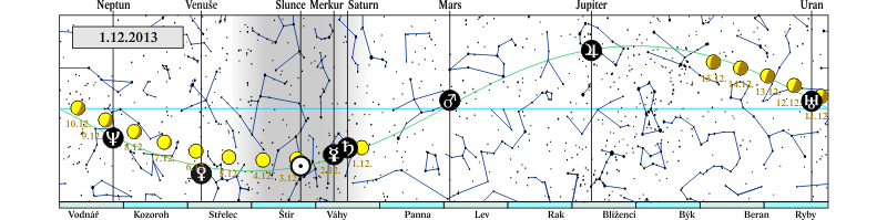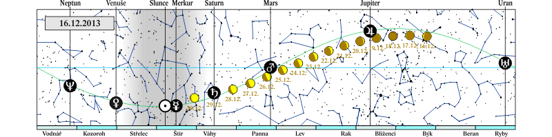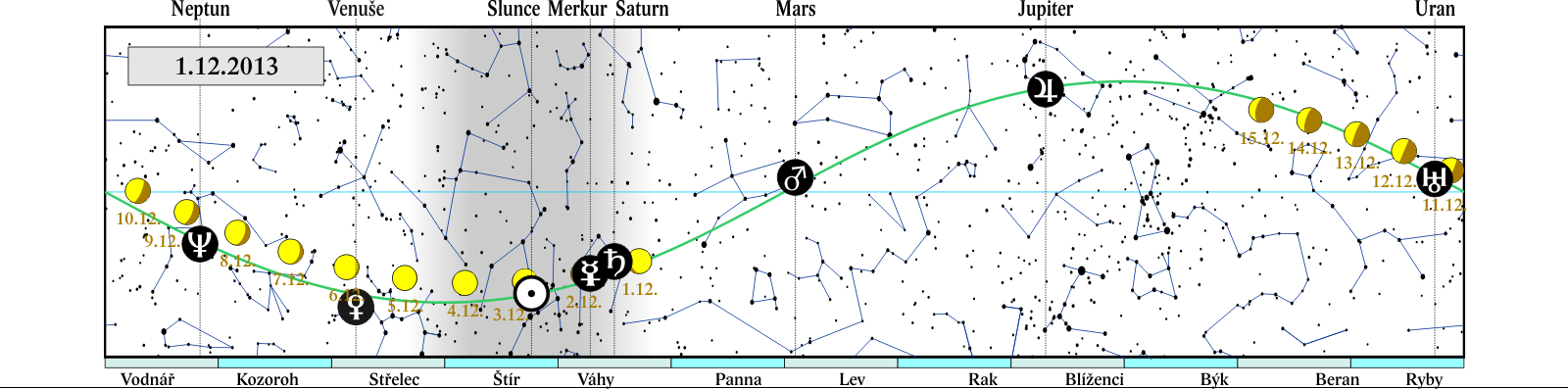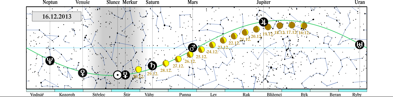 Měsíc v konjunkci s Jupiterem (Měsíc 5,7° jižně; přibližování Měsíce k Jupiteru pozorovatelné po celou noc z 18. na 19. 12.) |