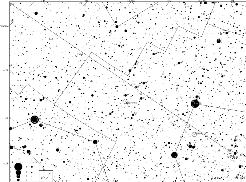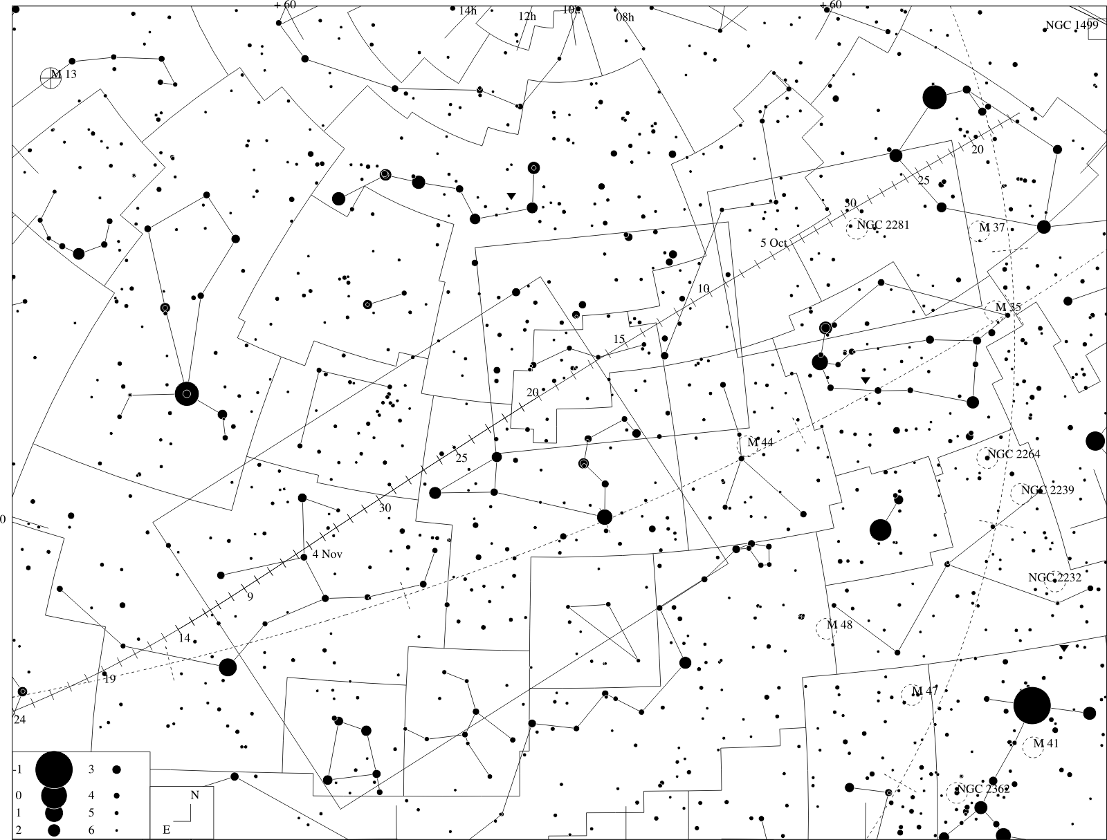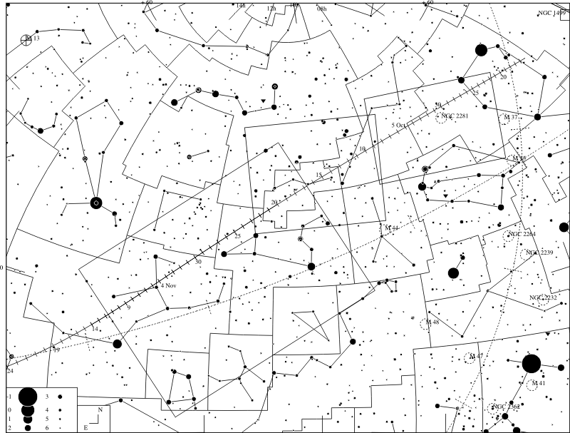 E ~ elongace; m ~ jasnost; A ~ azimut; h ~ výška |