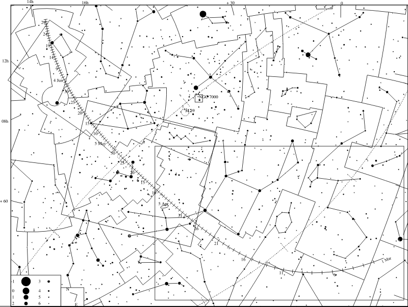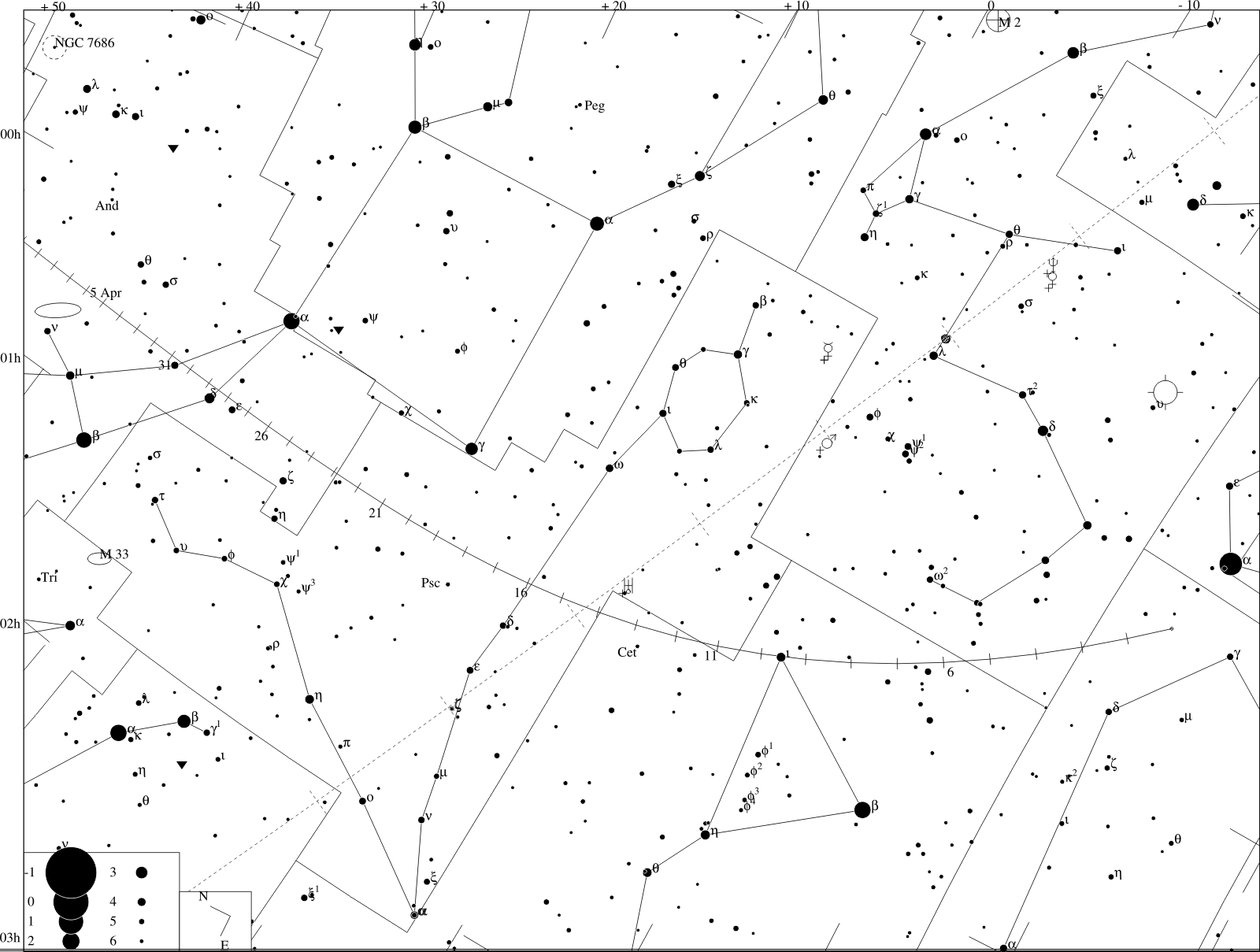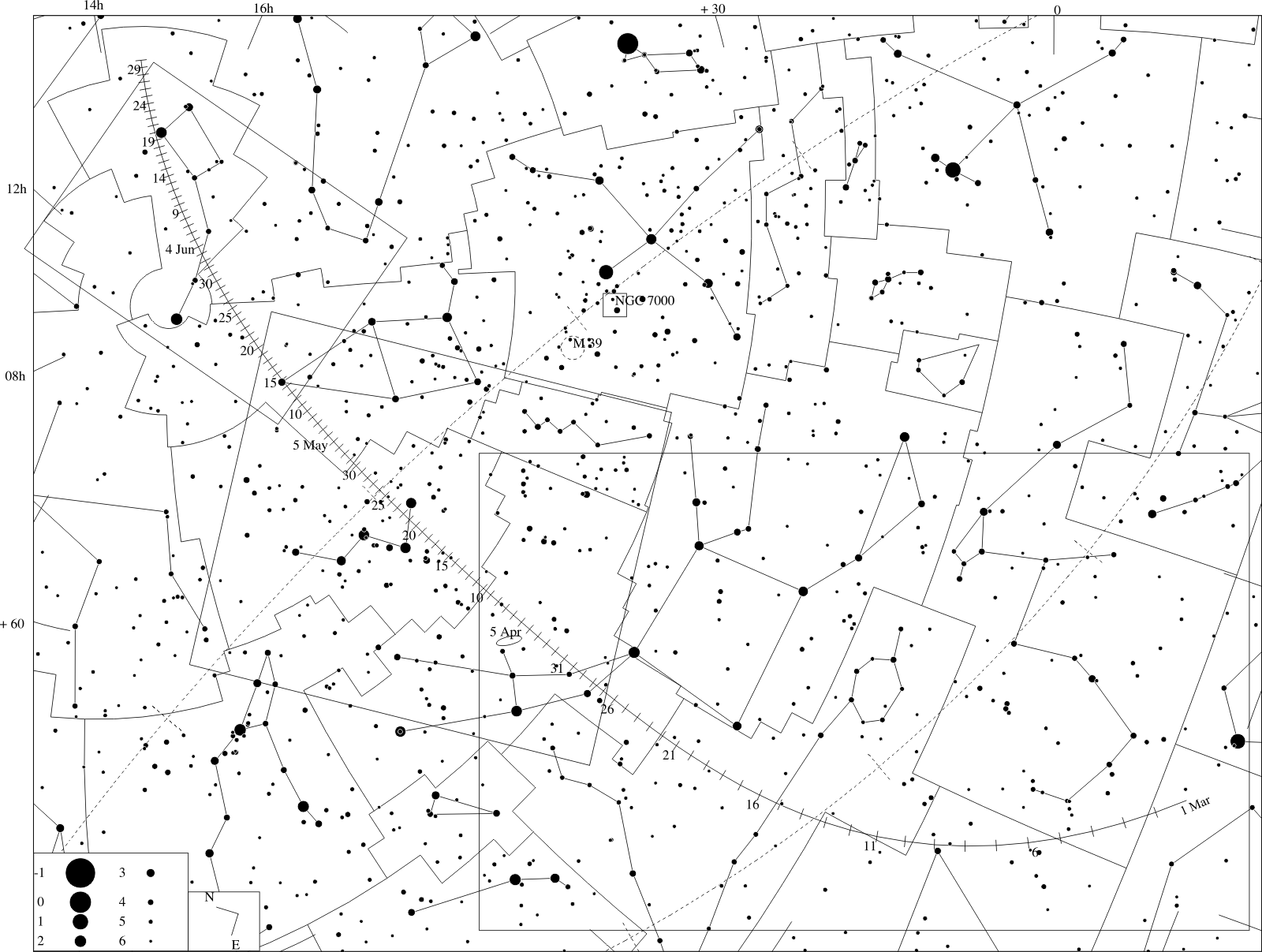 E ~ elongace; m ~ jasnost; A ~ azimut; h ~ výška |