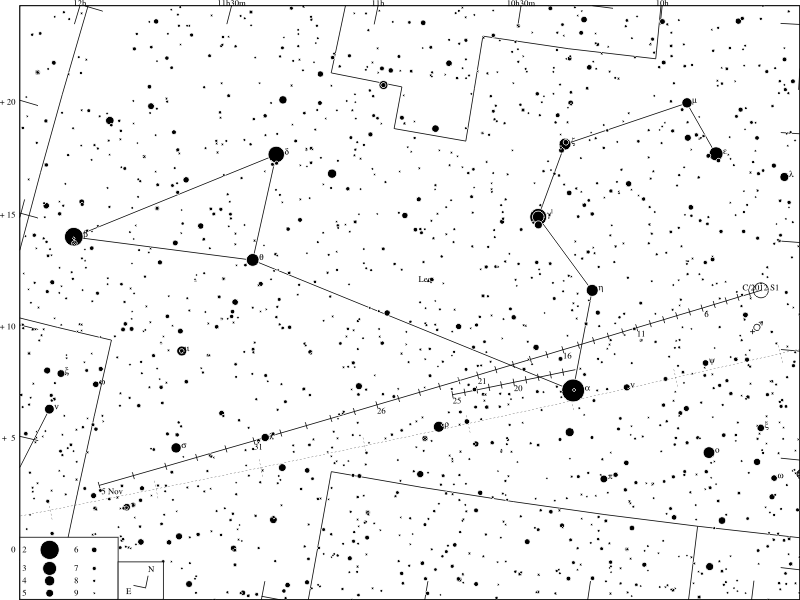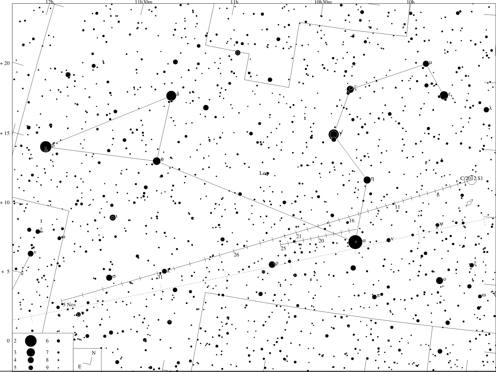 Kometa by podle současných standardních fotometrických parametrů (abs. magnituda 6, mocnina 10) měla být pozorovatelná malými dalekohledy od konce září 2013. Naleznete ji v souhvězdí Lva, tedy ráno nízko nad východním obzorem. Po celý říjen bude kometa na pozemské obloze doprovázet planetu Mars, od které bude na počátku října do 2°. (Dne 1. října prolétne jádro komety pouze 0,08 AU od Marsu). Dne 15. října nastane na pozemské obloze dvojitá konjunkce hvězdy Regulus, planety Mars (1°) a komety ISON (2,2°). Dne 18. října 2013 pak dojde k nejmenšímu přiblížení Marsu a komety na úhlovou vzdálenost pod 1°. Na začátku listopadu by kometa mohla již být viditelná pouhým okem, ale 6. listopadu poklesne její elongace pod 30°. Dne 18. listopadu kometa prolétne 20‘ od hvězdy Spica (Vir), v té době však její elongace bude pod 17°, ale jasnost by se již mohla pohybovat kolem 3 mag. Dne 25. listopadu dojde k přiblížení komety ISON (o jasnosti kolem 0 mag) na 1,2° ke kometě 2P/Encke (asi 5 mag). Jev se však odehraje v elongaci 15° od Slunce. K průchodu přísluním dojde 28. listopadu 2013 v souhvězdí Štíra (Sco). Ze sluneční záře bude kometa vylétat prakticky kolmo k ekliptice směrem na sever (a bude tedy objektem pozorovatelným téměř výhradně ze severní polokoule). Možnost jejího pozorování v následujících dnech (možná za bílého dne) je tedy reálná, nakolik v těsném okolí přísluní by tato kometa mohla být srovnatelná s C/2006 P1 (McNaught) [která v lednu 2007 dosáhla asi -6 mag a byla pozorovatelná za bílého dne i z našich zeměpisných šířek]. Již 1. prosince 2013 bude kometa C/2012 S1 na obloze 10° severně od Slunce, a při očekávané jasnosti kolem -2 mag by měla být pozorovatelná ráno nad východním obzorem na rozhraní souhvězdí Štíra (Sco) a Hadonoše (Oph). Geometrie průletu je natolik výjimečná, že kometa by si v první polovině prosince mohla vytvořit velmi dlouhý ohon. Pouhým okem by měla být pozorovatelná do poloviny ledna 2014, v dosahu malých dalekohledů bude ještě v únoru 2014.