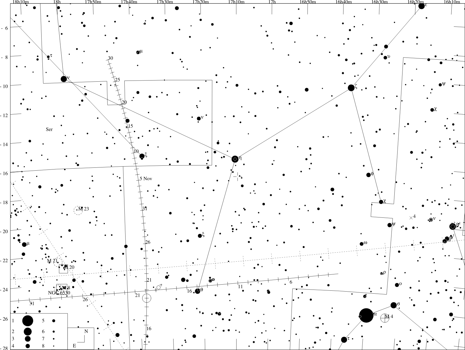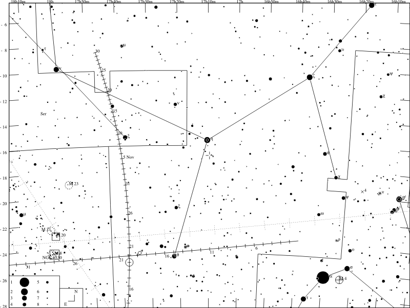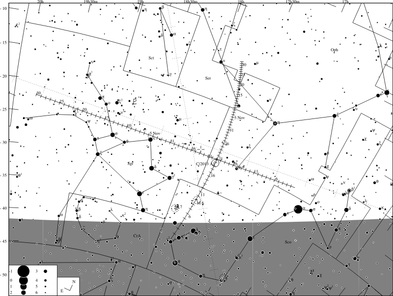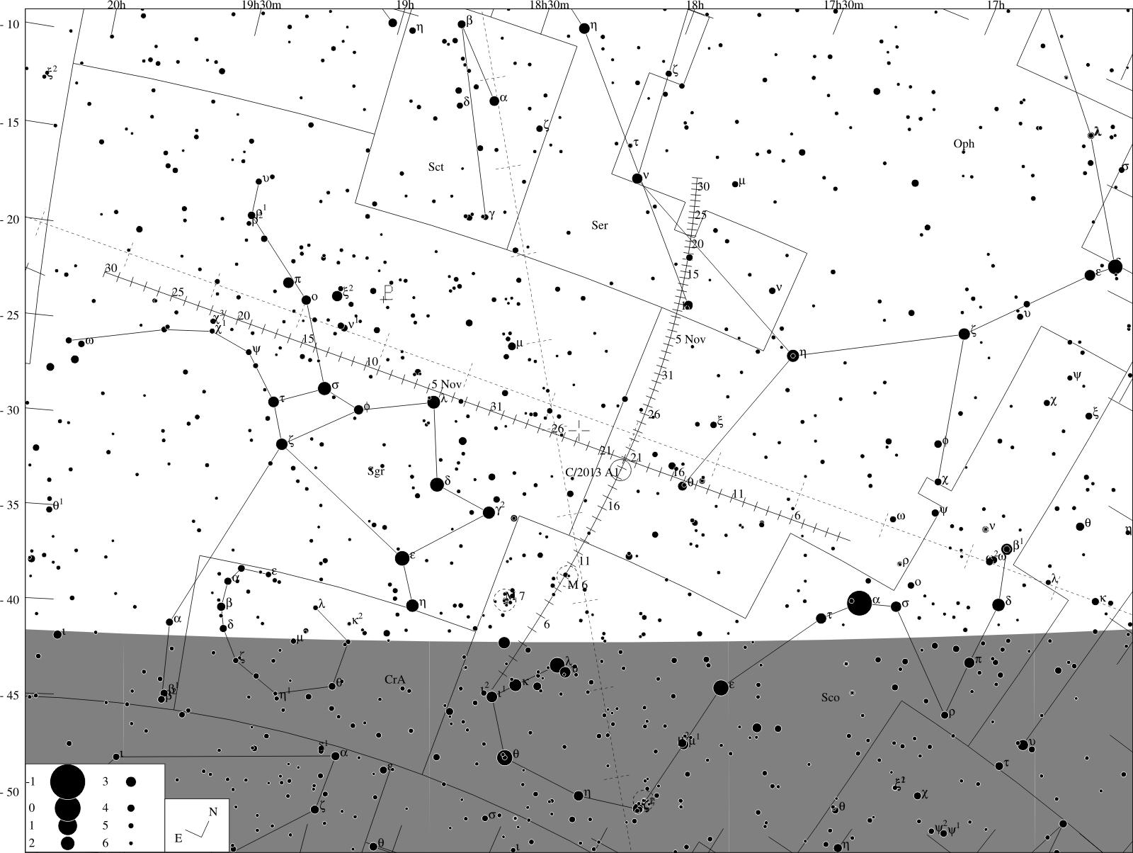 Vzhledem k přiblížení komety k planetě Mars uveřejňujeme i vyhledávací mapku, na které je vyznačen rovněž pohyb Marsu. Přehledová mapka zachycuje situaci 19. října v 18h SEČ, kdy se Mars bude nacházet necelých 10° nad západním obzorem. Kometa se v průběhu října a listopadu bude pohybovat směrem na sever ze souhvězdí Štíra (Sco) do Hadonoše (Oph).
