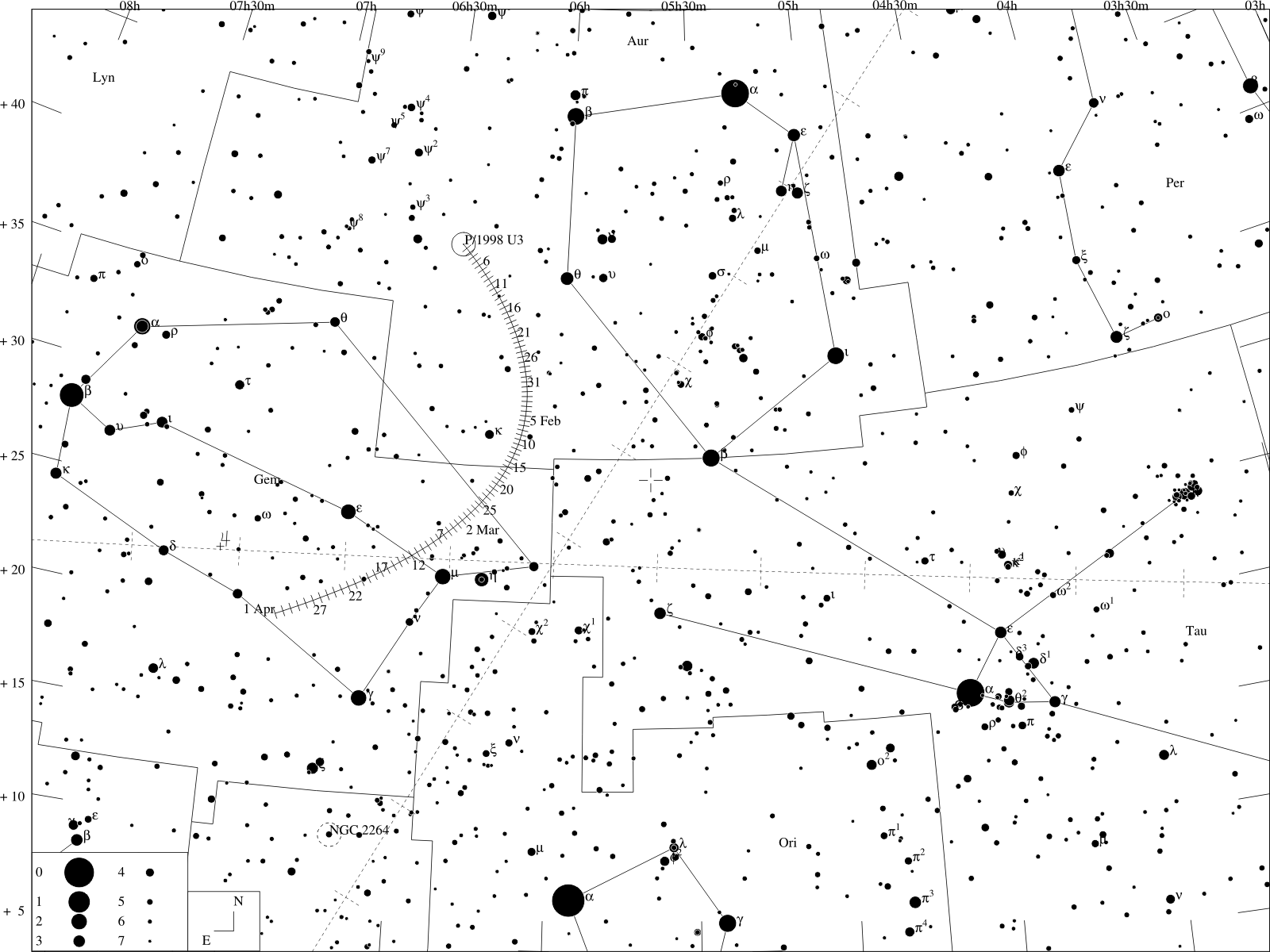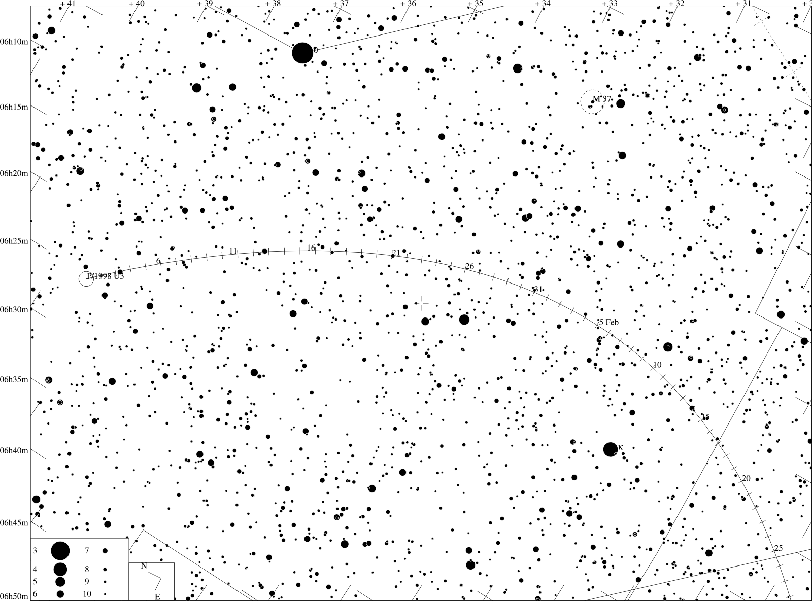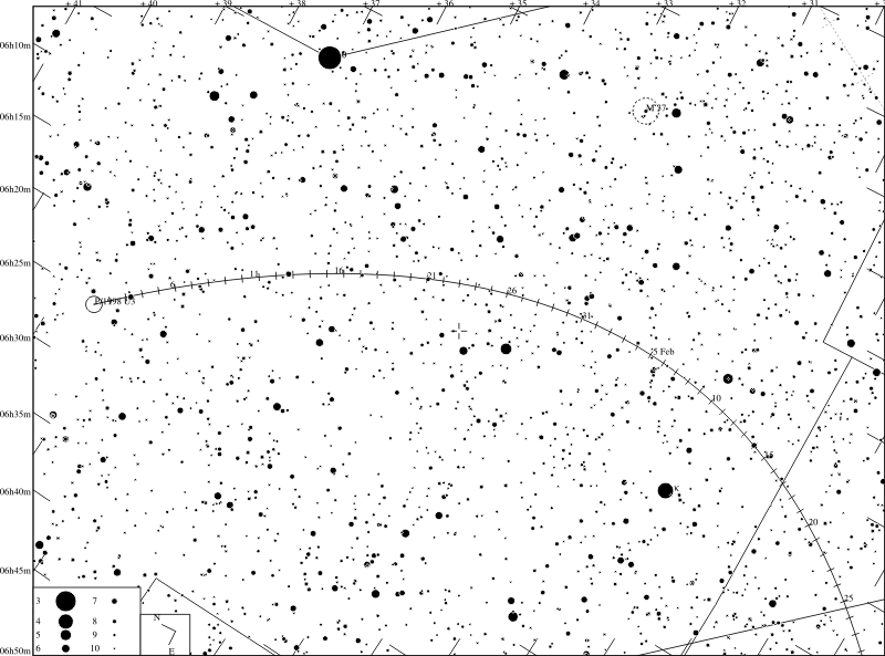 Podmínky pro její pozorování jsou vynikající od ledna do konce března 2014. Kometa se bude pomalu pohybovat souhvězdím Vozky (Aur) a od první poloviny února Blíženců (Gem). Při vysoké elongaci i deklinaci bude z našich zeměpisných šířek vrcholit více jak 70° nad obzorem. Geometrické podmínky pro její pozorování se začnou zhoršovat až v průběhu dubna, kdy bude pozorovatelná jen níže nad obzorem. Uveřejňujeme vyhledávací mapku pro leden 2014 s hvězdami do 10 mag.