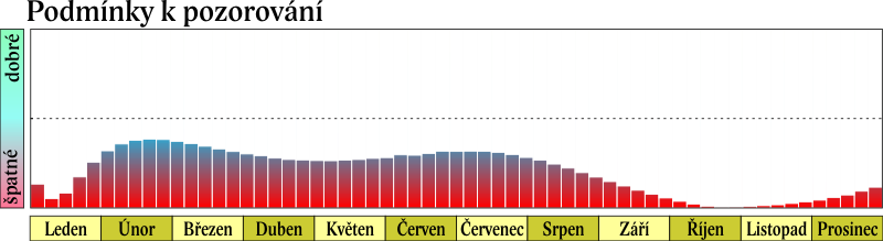 Nejpříznivější podmínky na pozorování Venuše jsou v únoru a v březnu. Maximální jasnosti (-4,6 mag) dosahuje 15. 2. v 6 h SEČ, největší západní elongace (47° od Slunce) 22. 3. ve 20 h SEČ. Ze souhvězdí Střelce, v němž je 31. 1. ve 20 h stacionární, se v březnu přesune do Kozoroha a v následujících měsících projde souhvězdími Vodnáře, Berana, Býka, Blíženců, Raka a Lva. Od dubna do konce září bude pozorovatelná ráno nízko nad východním až severovýchodním obzorem. V říjnu a listopadu je nepozorovatelná. Horní konjunkce se Sluncem nastává 25. 10. v 9 h SEČ v souhvězdí Panny. Během listopadu a prosince Venuše projde souhvězdími Štíra a Hadonoše do Střelce. Na koci roku se znovu objevuje na večerní obloze nízko nad jihozápadním obzorem. Na konci občanského soumraku je však necelé 4° nad obzorem, zapadá během nautického soumraku.