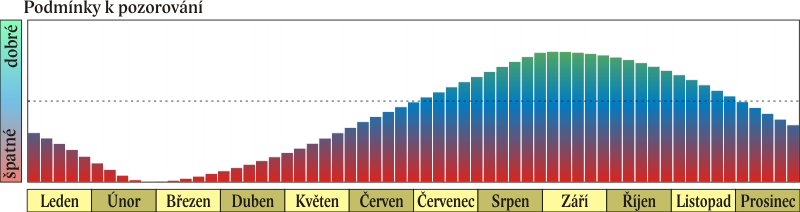 Na podzim se planeta postupně přesouvá na večerní oblohu. Koncem listopadu se na začátku astronomické noci nachází 30° nad jižním obzorem a zapadá necelou hodinu před půlnocí, na konci roku zapadá už po 21. hodině.