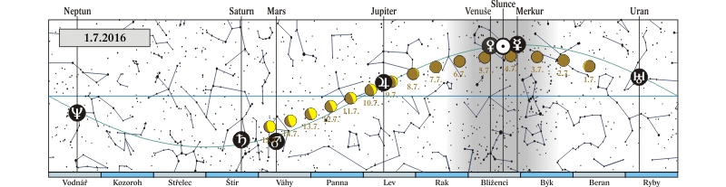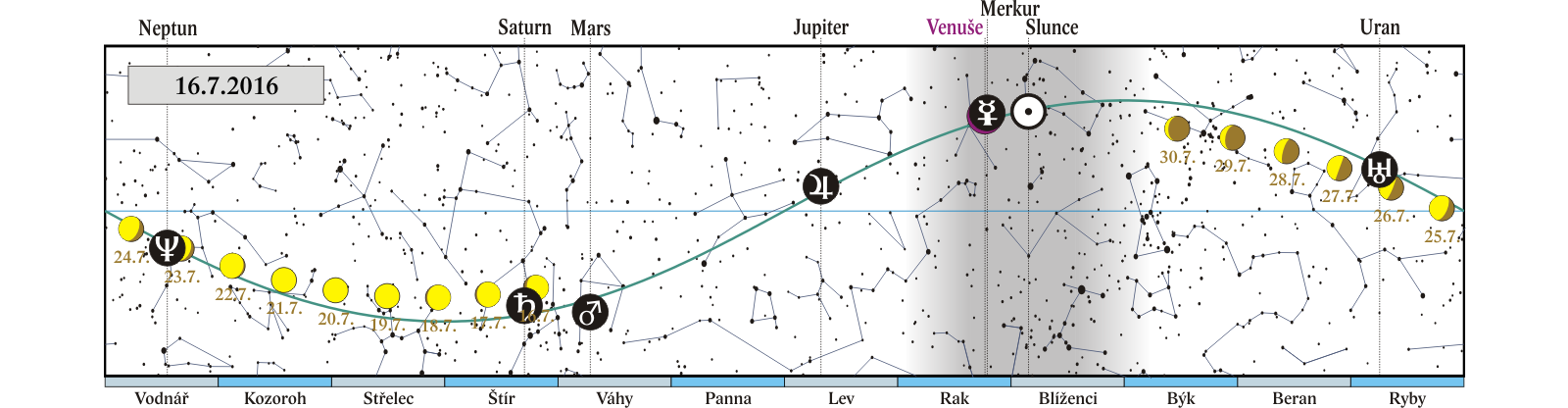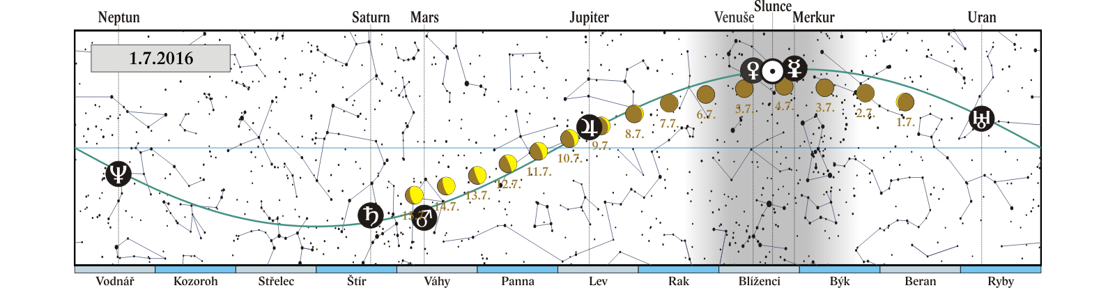 Saturn v konjunkci s α Sco (Antares 6,2° jižně; večer na jihu a jihozápadě seskupení Marsu a Saturnu s Antarem) |