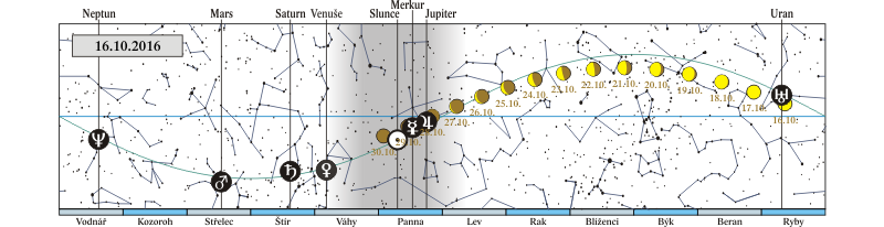 Měsíc v konjunkci s α Tau (Aldebaran 0,3˚ severně; těsná konjunkce nad naším obzorem ve dne, ráno pozorovatelné přibližování Měsíce k Aldebaranu) |