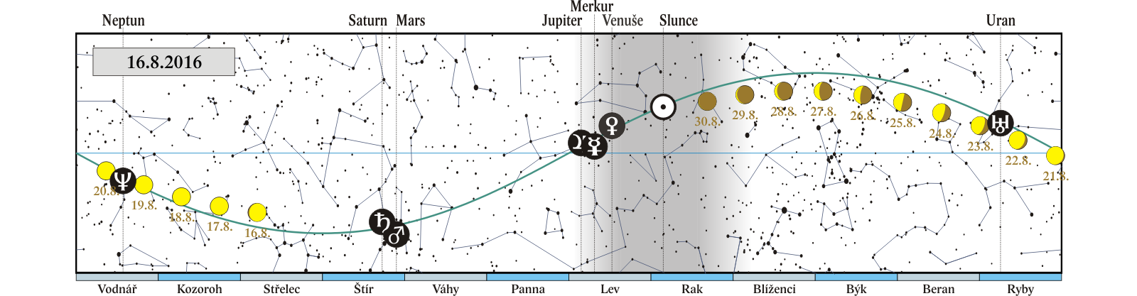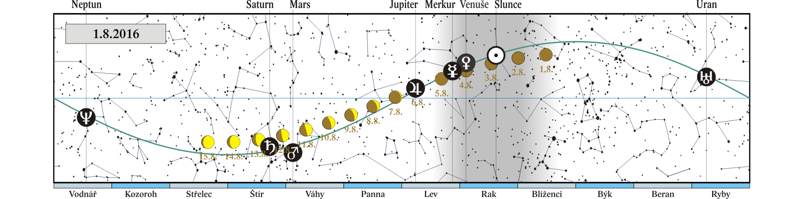 Mars v konjunkci s α Sco (Antares 1,8° jižně; večer na jihozápadě seskupení Marsu a Saturnu s Antarem pozorovatelné do konce září) |