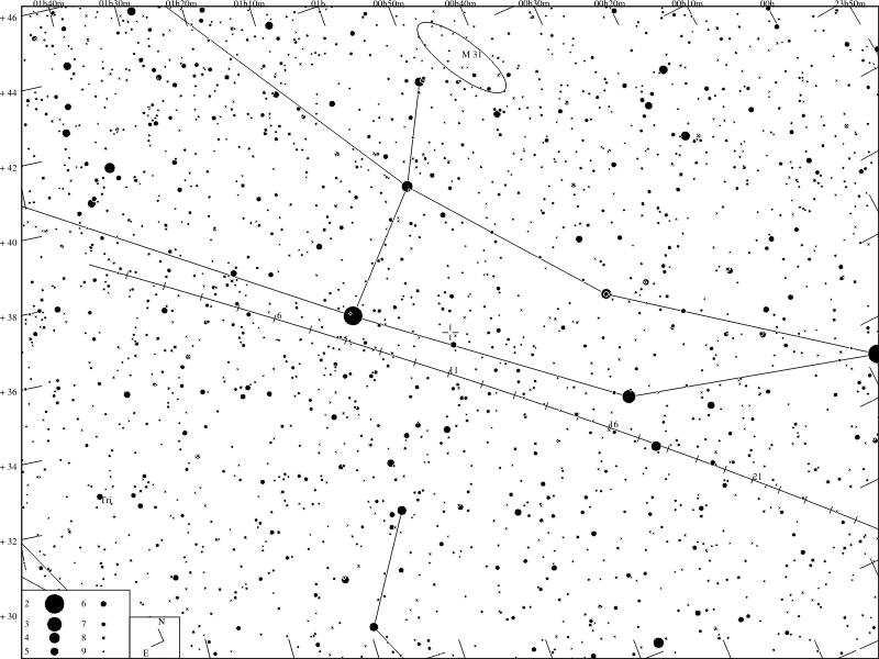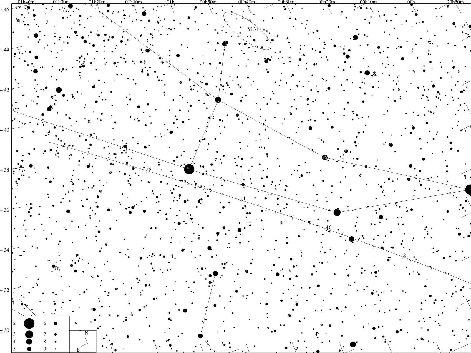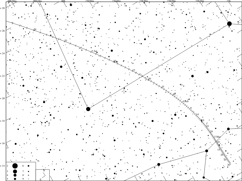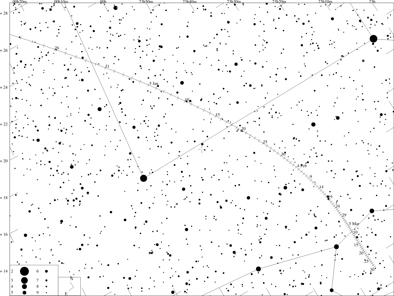 Pro období s vhodnými pozorovacími podmínkami uveřejňujeme efemeridu a také vyhledávací mapku, která má tři části. Situaci dokumentuje přehledová mapka s hvězdami do 7 mag, která zachycuje souhvězdí Andromedy (And) a Pegase (Peg). První úsek detailní mapky pro 1. až 25. prosince 2015 obsahuje hvězdy do 9,5 mag a zachycuje jižní části souhvězdí Andromedy (And). Druhý úsek pro období od 25. prosince 2015 do 30. března 2016 obsahuje rovněž hvězdy do 9,5 mag a zachycuje jihovýchodní část souhvězdí Pegase (Peg) společně se západní částí souhvězdí Ryb (Psc).