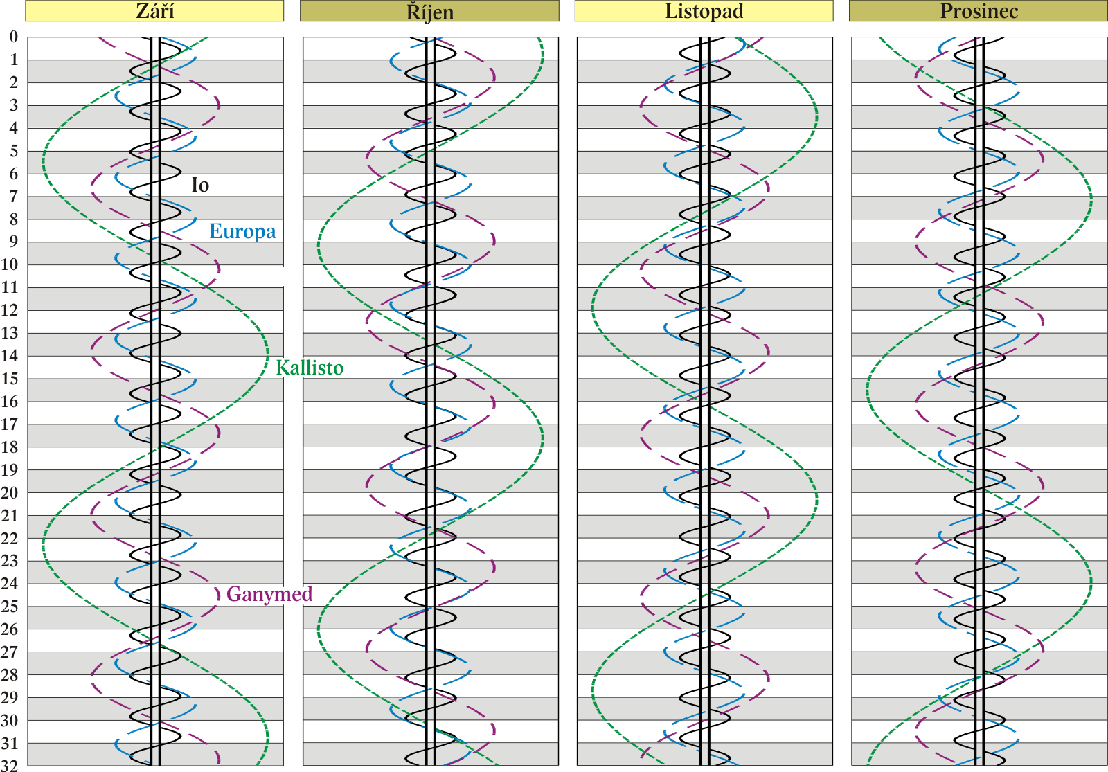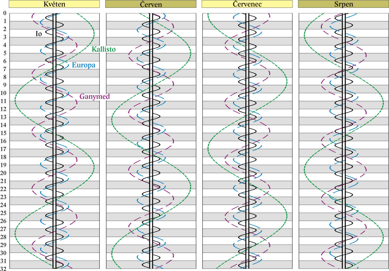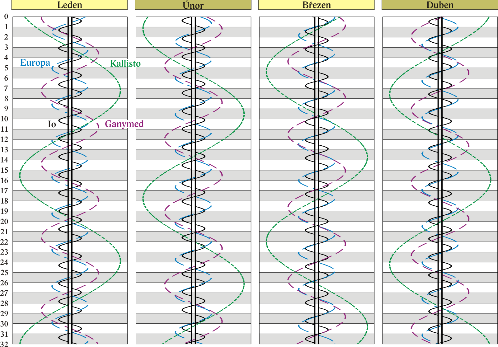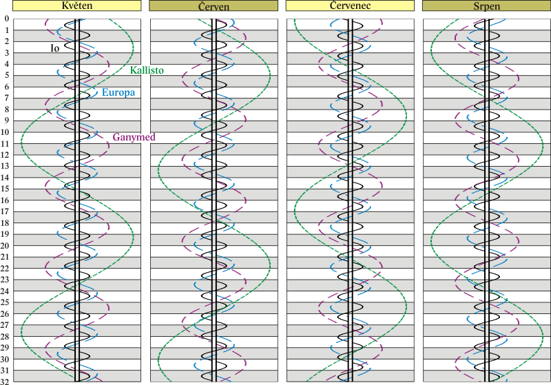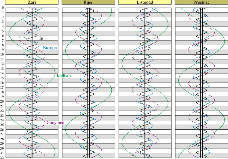 Grafy poloh čtyř největších měsíců Jupitera.