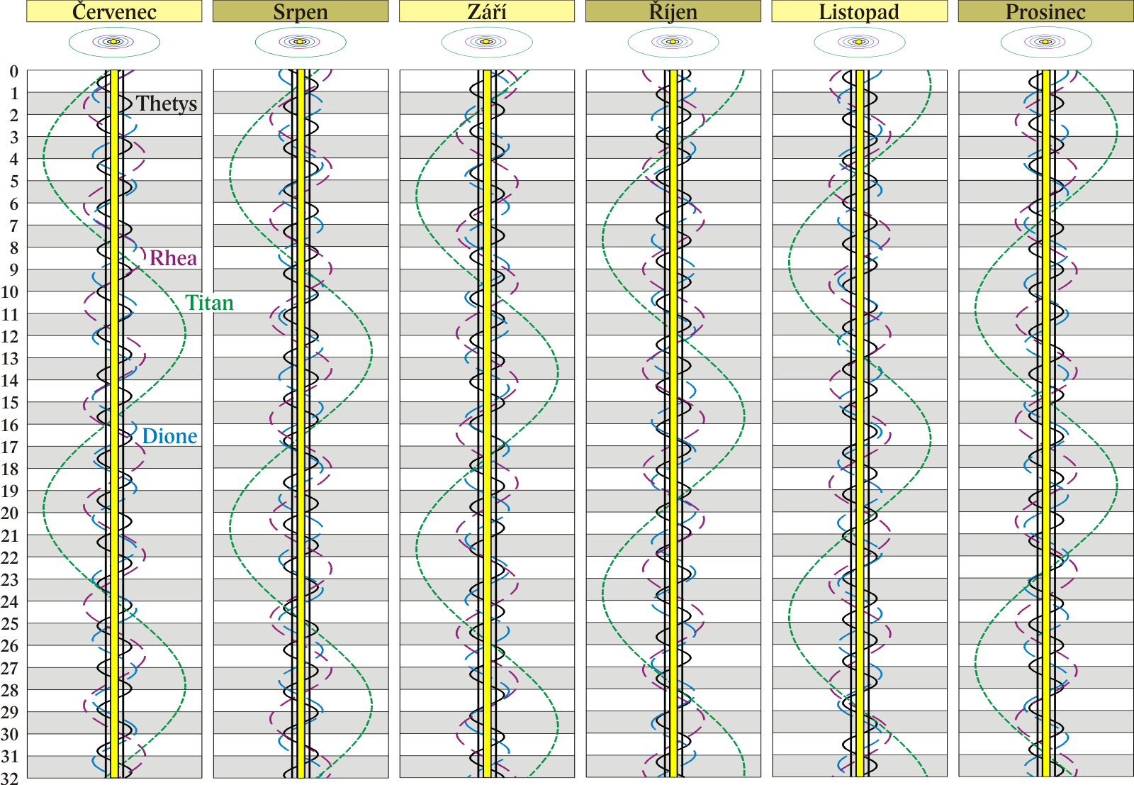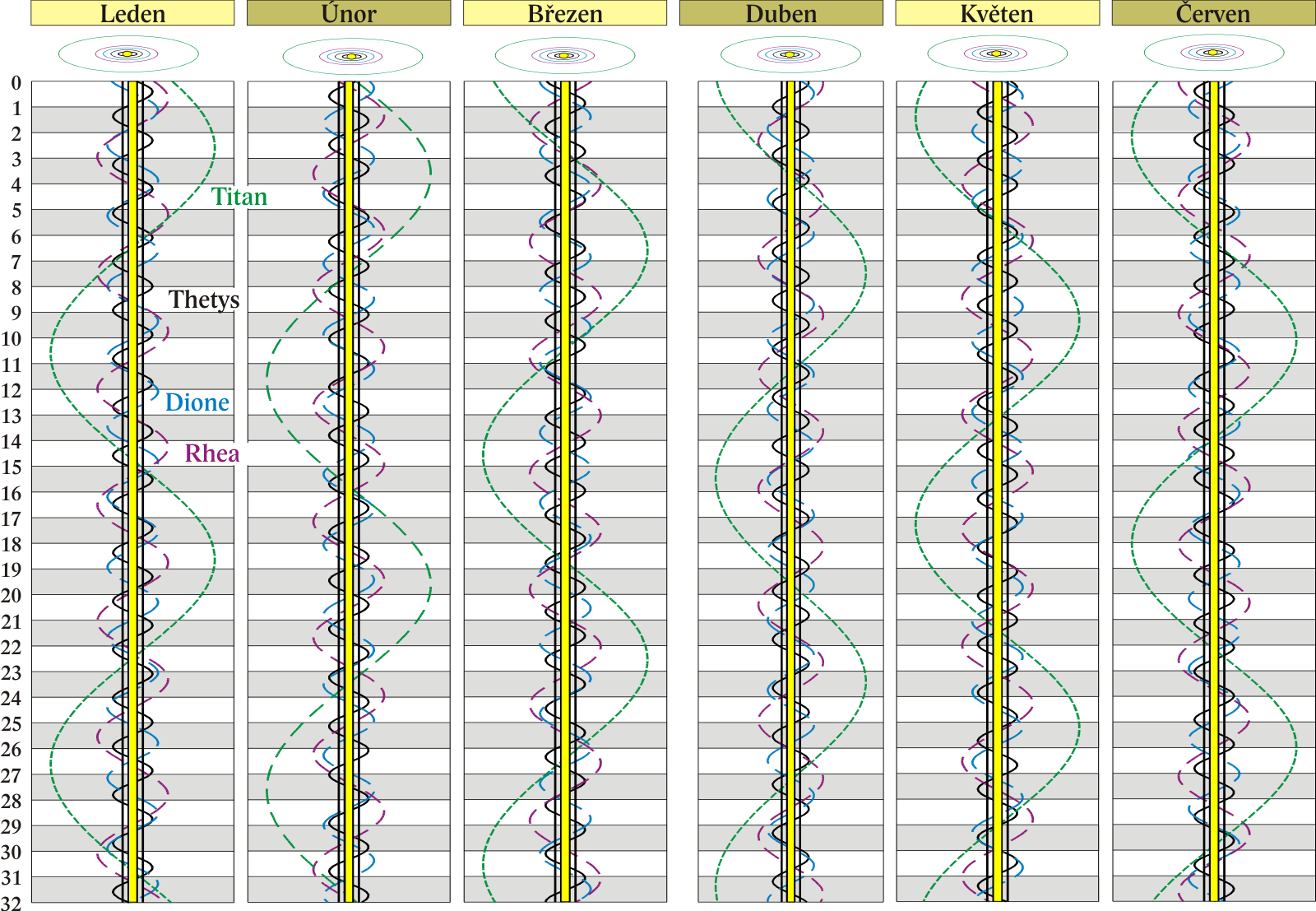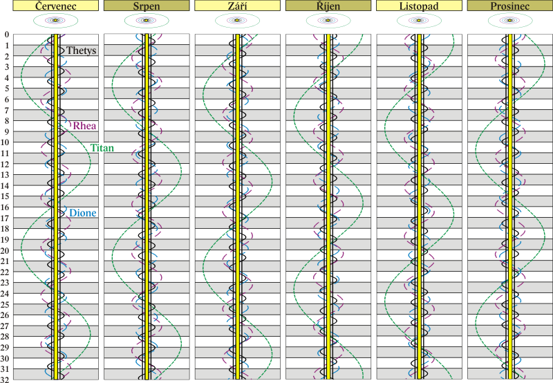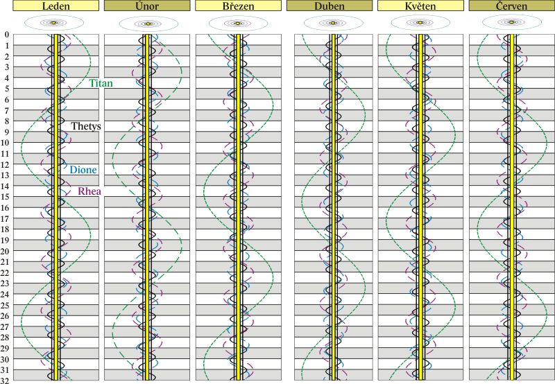Grafy poloh čtyř největších měsíců Saturna.