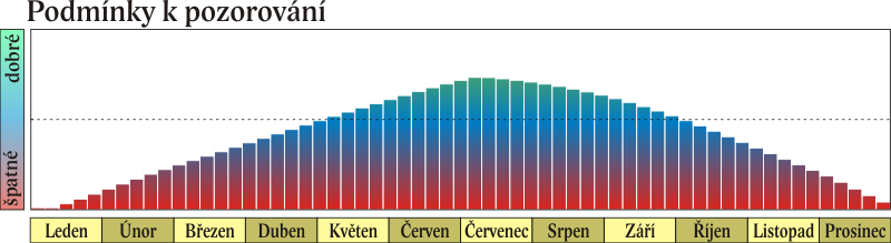 Přijatelné podmínky viditelnosti nastávají zhruba od dubna do konce srpna, nejpříznivější jsou v červenci. Trpasličí planetu Pluto nalezneme v souhvězdí Střelce. Země se k Plutu nejvíce přiblíží dva dny před jeho opozicí se Sluncem (5. 7. v 18 h SEČ, 32,12 AU). Podmínky k nalezení Pluta se neustále nepatrně zhoršují, jeho jasnost díky vzdalování od Slunce klesá a současně se posouvá ke stále jižnějším deklinacím.