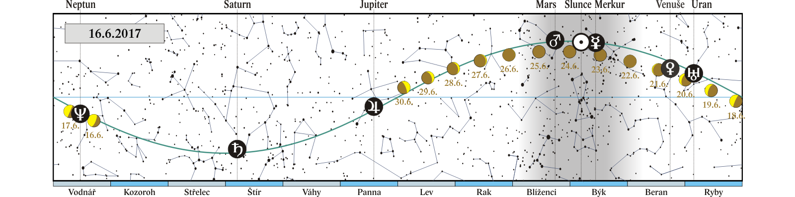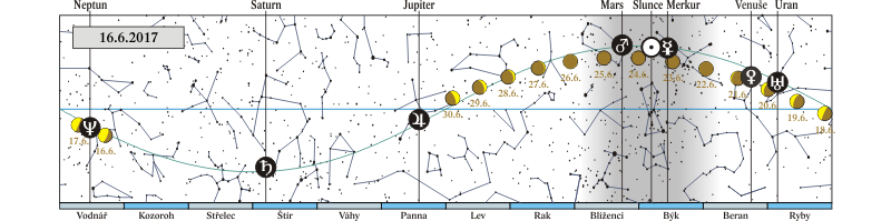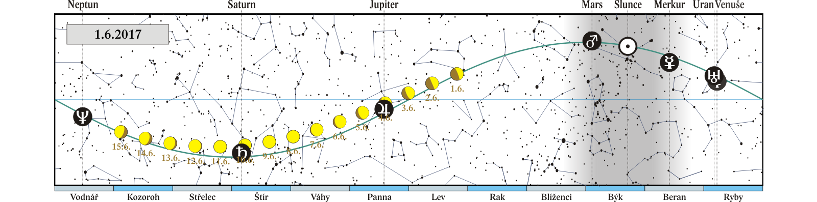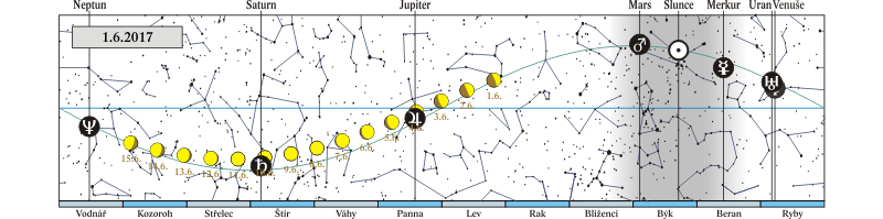 Měsíc v konjunkci s Jupiterem (Měsíc 1,4° severně; seskupení Měsíce, Jupiteru a Spiky 3. a 4. 6.) |