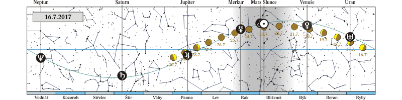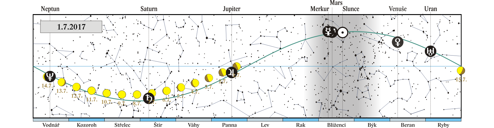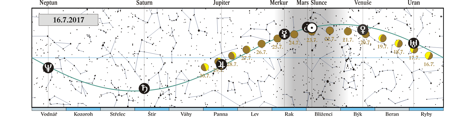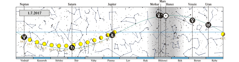 Měsíc v konjunkci s α Sco (Antares 8,8° jižně; konjunkce v rektascenzi půl hodiny po západu hvězdy pod obzor) |