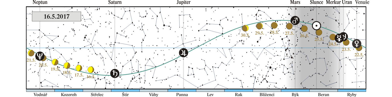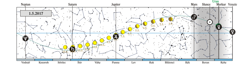 Měsíc v konjunkci s Jupiterem (Měsíc 1,2° severně; seskupení Měsíce, Jupiteru a Spiky 7. a 8. 5.) |