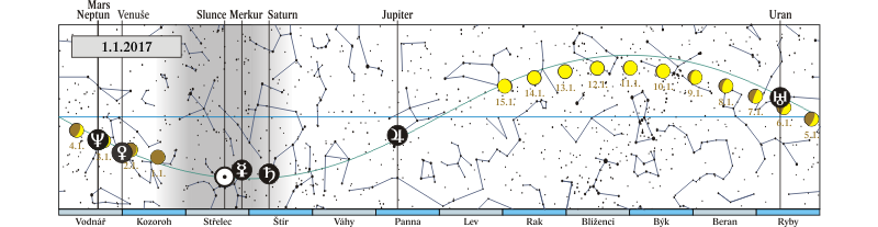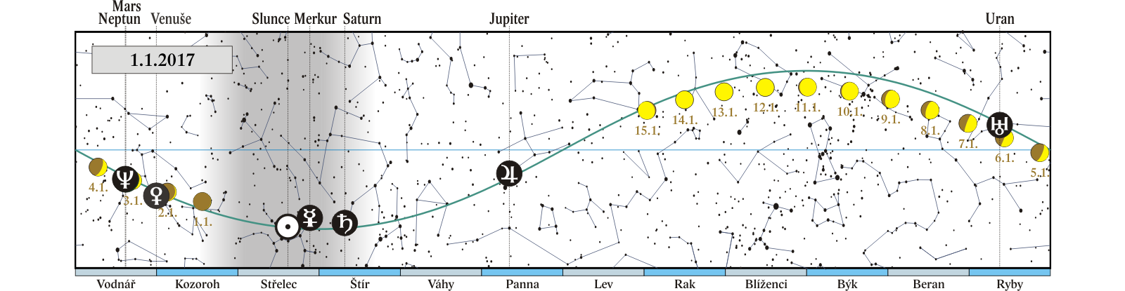 Mars v konjunkci s Neptunem (Mars 0,0° jižně; extrémně těsné přiblížení pod naším obzorem, planety pozorovatelné 31. 12. 2016 večer) |