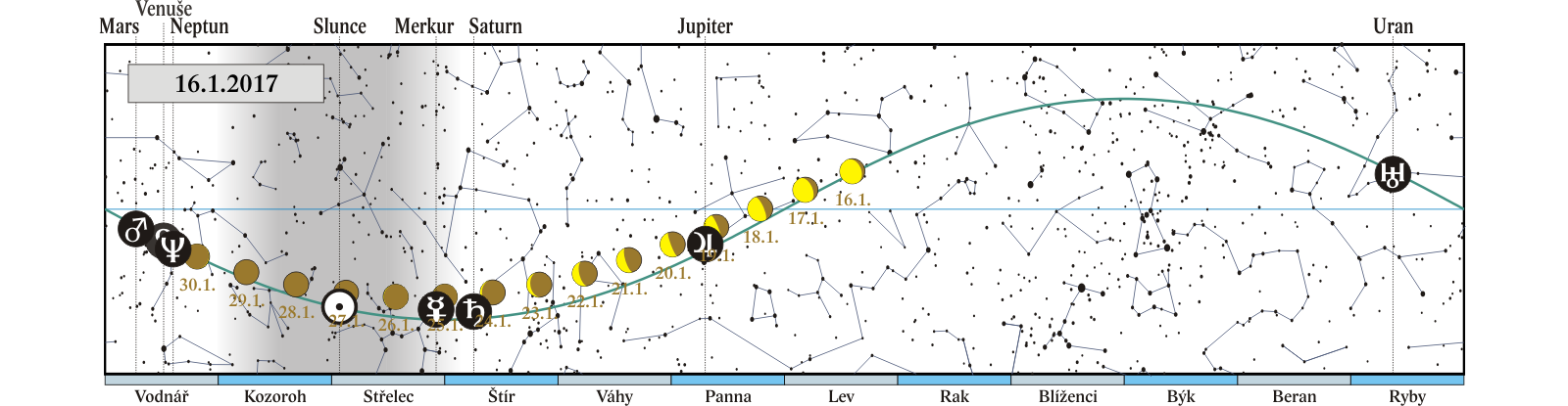 Měsíc v konjunkci s α Vir (Spica 5,5° jižně; seskupení Měsíce, Jupiteru a Spiky na ranní obloze) |