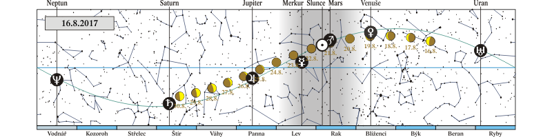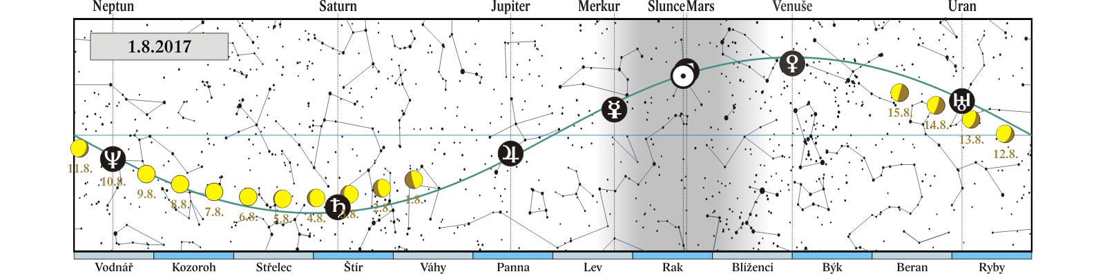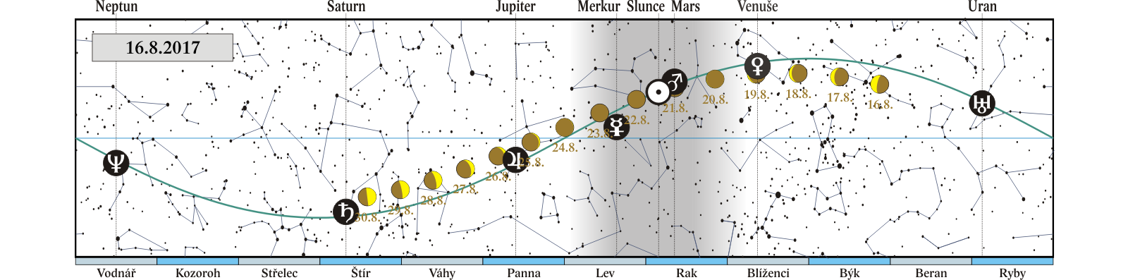 Měsíc v konjunkci s Jupiterem (Měsíc 2,5° severně; seskupení Měsíce, Jupiteru a Spiky večer nízko nad západním obzorem) |