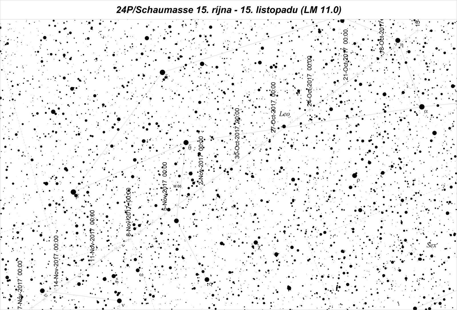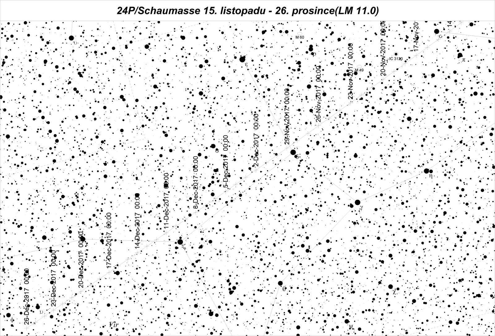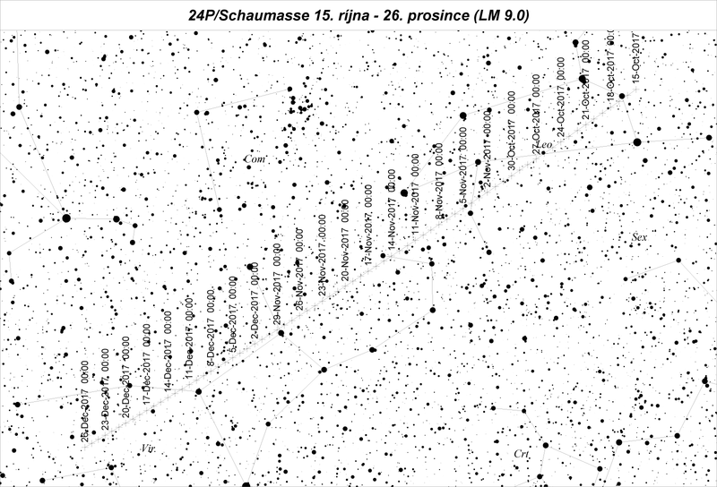 Jasná kometa 24P/Schaumasse je viditelná malými dalekohledy ve většině svých návratů. Bohužel její letošní návrat nepatří k těm nejlepším. Po celý rok se nevzdálí úhlově od Slunce o více než 60° a od Země si bude držet uctivý odstup 1,461 AU a více. V maximu jasnosti přesto bude menšími dalekohledy viditelná s jasností 10,2 mag. V září se budou lepšit podmínky viditelnosti a v prvních dnech měsíce zjasní nad 14 mag, do konce září pak až k 12,2 mag na ranní obloze. V říjnu bude dále zjasňovat a na konci měsíce bude 10,5 mag. V polovině listopadu dosáhne maxima jasnosti 10,2 mag a do konce měsíce si jasnost udrží. V prosinci začne rychle slábnout, v polovině měsíce zeslábne pod 11 mag a na konci bude mít okolo 11,8 mag. Celé období pozorovatelnosti bude na ranní obloze viditelná nejlépe před začátkem svítání.