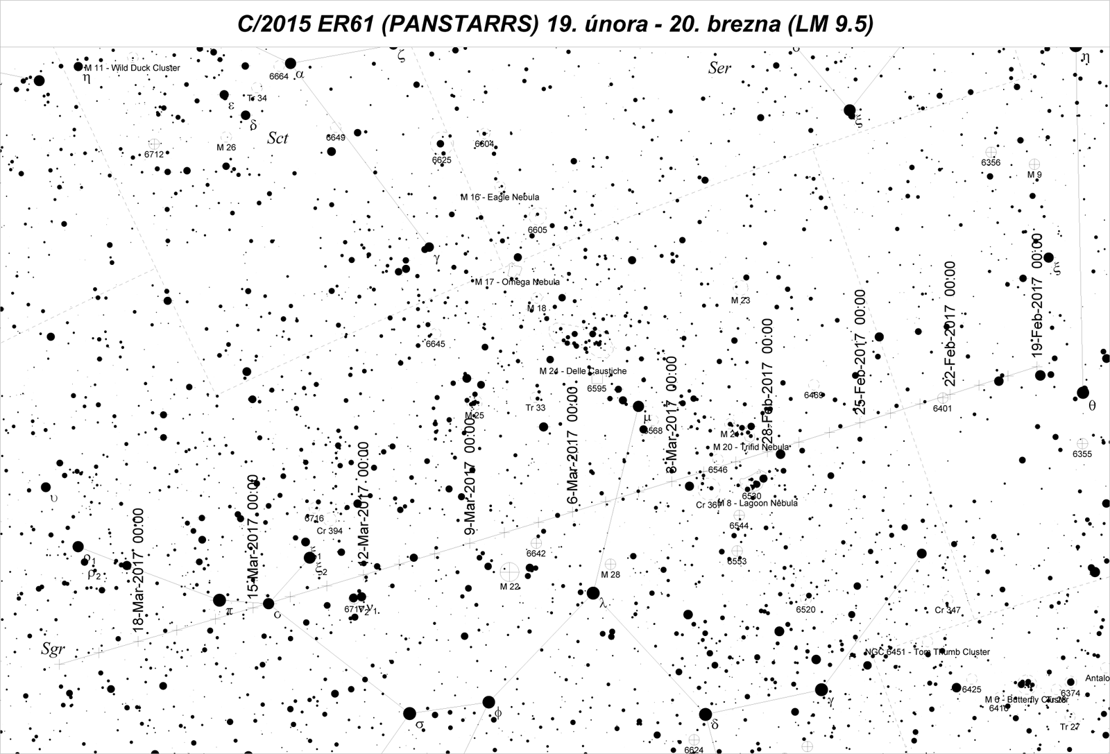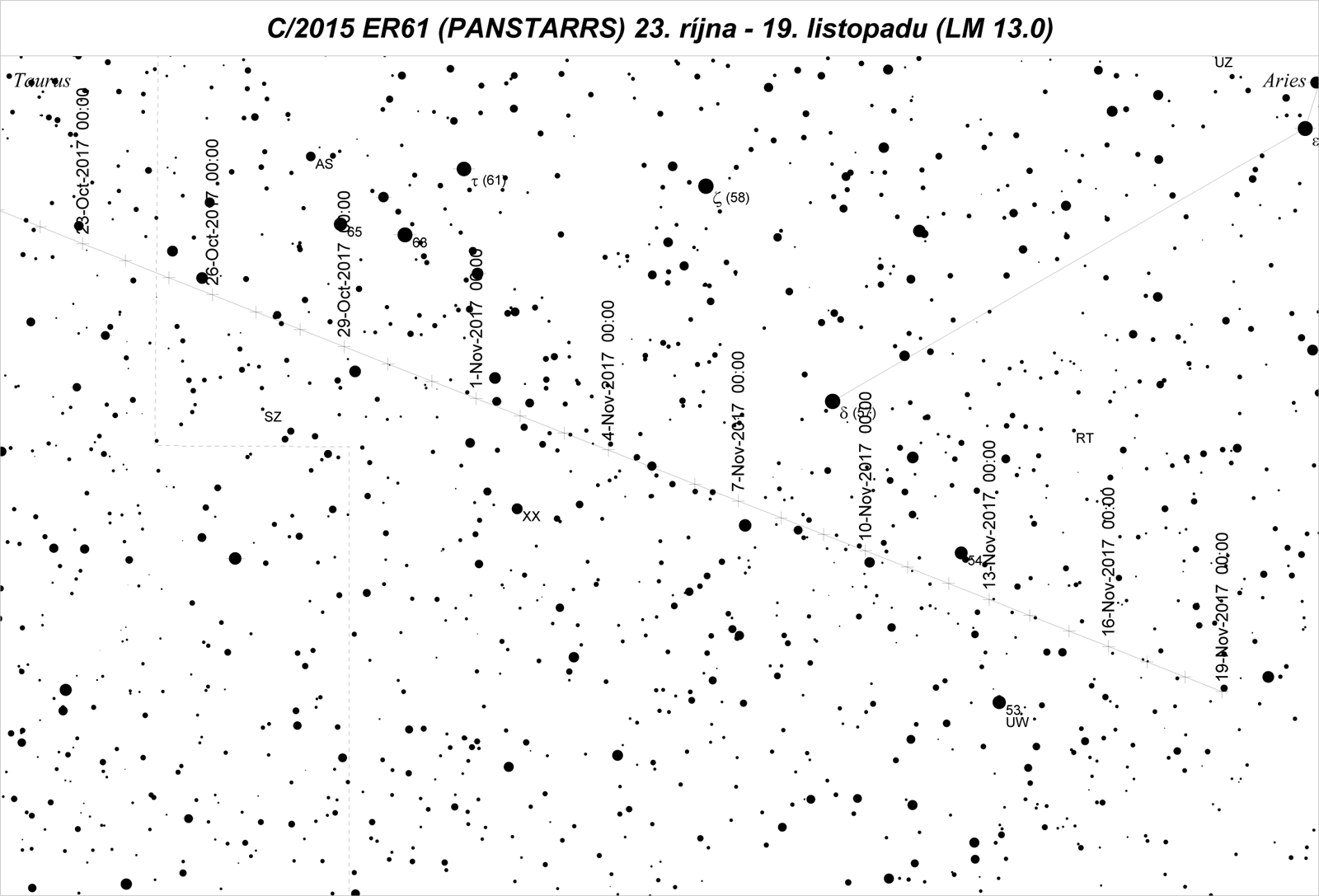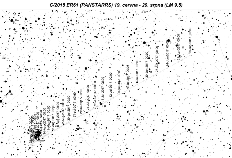 RA ~ rektascenze; Dec ~ deklinace; r ~ vzdálenost od Slunce; Δ ~ vzdálenost od Země;