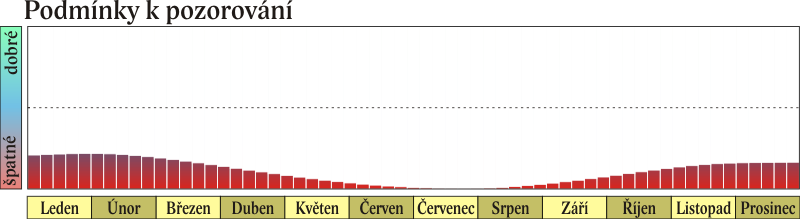 Letošní rok je z hlediska pozorovatelnosti planety nepříznivý. Opozice se Sluncem nenastává. Na začátku roku najdeme Mars na večerní obloze spolu s Venuší, a to v souhvězdí Vodnáře. Na začátku nautického soumraku Mars svítí ve výšce 28° nad jihojihozápadním obzorem jako načervenalá hvězda s jasností +0,8 mag. Zapadá okolo 21. hodiny. V následujících měsících se jeho viditelnost zhoršuje, v dubnu a květnu už je večer vidět jen nízko nad západním obzorem a počátkem června začne být nepozorovatelný. Jasnost v tomto období postupně klesne až na +1,7 mag. Po celý rok se Mars pohybuje přímo, V uvedeném období se ze souhvězdí Vodnáře přesune přes Ryby a Berana do souhvězdí Býka.