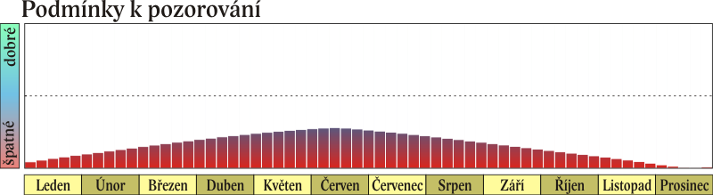 Saturn se nachází na hranici souhvězdí Hadonoše a Střelce. Prstence pozorujeme ze severní strany, tedy pozorovatelé na severní polokouli je v nepřevracejícím dalekohledu vidí „shora“. Jsou otevřeny na maximum, protože v letošním roce nastává na severní polokouli Saturnu letní slunovrat.