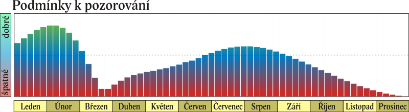 Nejpříznivější podmínky pro pozorování Venuše jsou letos na začátku roku a poté ve druhé polovině léta. V lednu je planeta Večernicí s jasností -4,3 mag. Na konci občanského soumraku ji najdeme ve výšce 23° nad jihojihozápadním obzorem. Zapadá až po 20. hodině. V následujících týdnech se viditelnost Venuše dále zlepšuje a planeta zjasňuje. Maximální východní elongace (47°) nastává 12. 1. ve 14 h SEČ a nejvyšší jasnosti planeta dosahuje -4,6 mag 17. 2. v 8 h SEČ. Ze souhvězdí Vodnáře se v tomto období přesouvá do Ryb, kde je 2. 3. v 15 h SEČ stacionární a začíná se pohybovat zpětně.