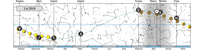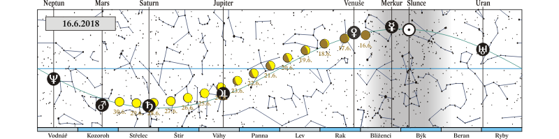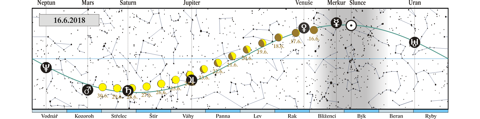 Měsíc v konjunkci s Jupiterem (Měsíc 3,2° severně; seskupení Měsíce, Jupiteru, planetky (4) Vesta, hvězdy Antares a Saturnu 23. až 27. 6.) |