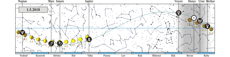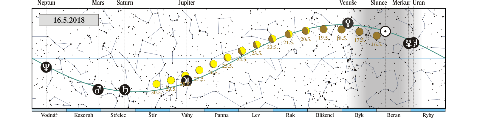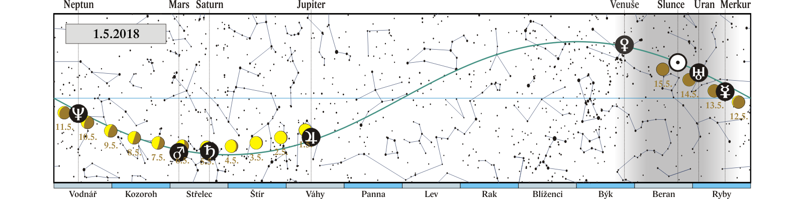 Měsíc v konjunkci s α Sco (Antares 8,4° jižně; seskupení Měsíce, Jupiteru, hvězdy Antares, Saturnu a Marsu na ranní obloze 1. – 6. 5.) |