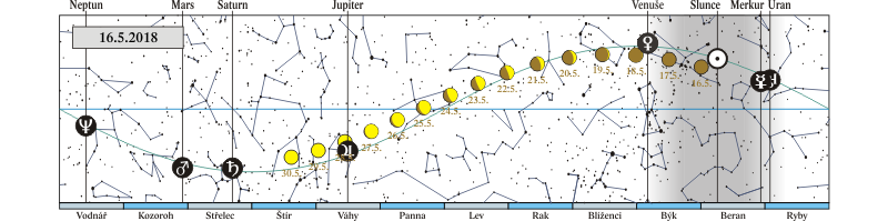 Měsíc v konjunkci s α Leo (Regulus 0,5° jižně; Měsíc v blízkosti Regulu pozorovatelný 21. 5. před půlnocí) |