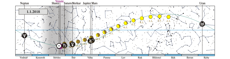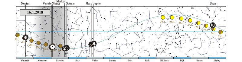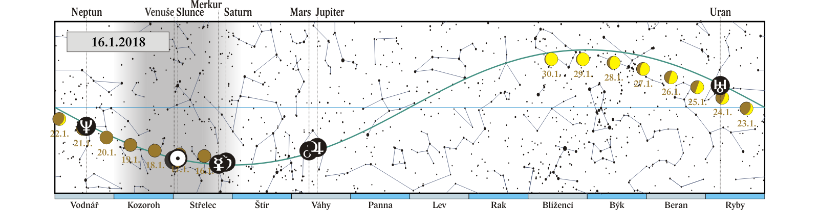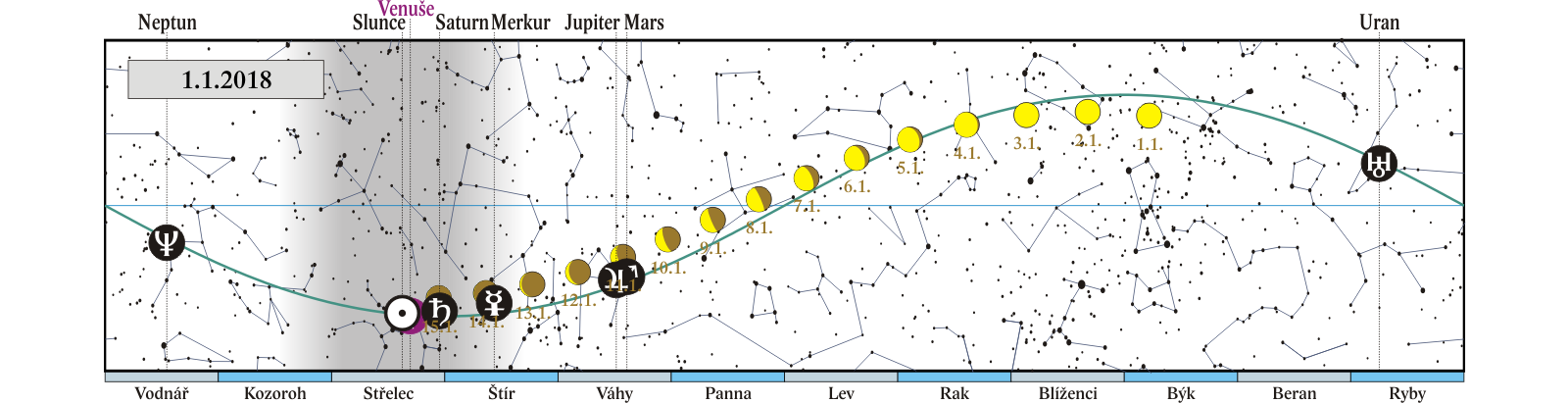 Měsíc v konjunkci s α Vir (Spica 6,7° jižně; seskupení Měsíce, Spiky, Jupiteru a Marsu na ranní obloze 9. až 12. 1.) |