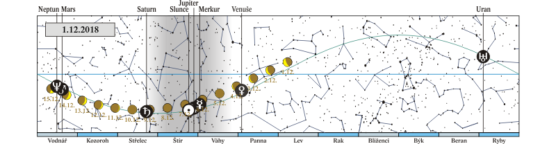 Měsíc v konjunkci s α Vir (Spica 7,2° jižně; ráno seskupení Měsíce, Spiky a Venuše nad jihovýchodním obzorem) |
