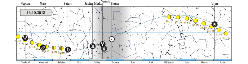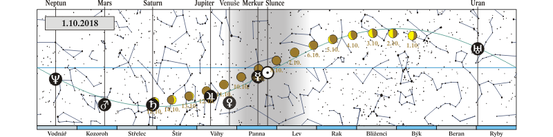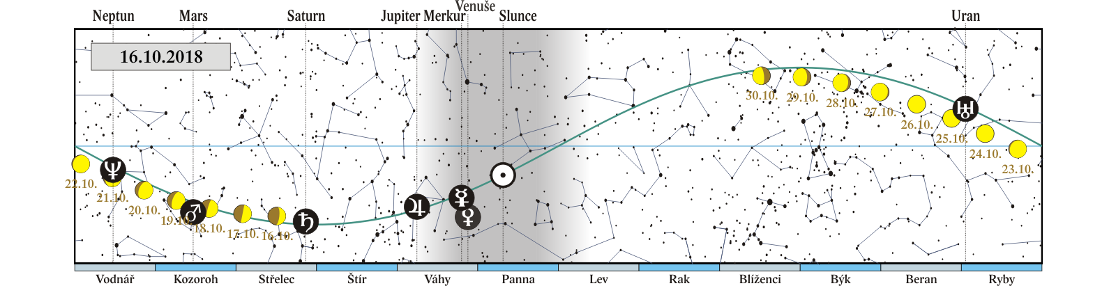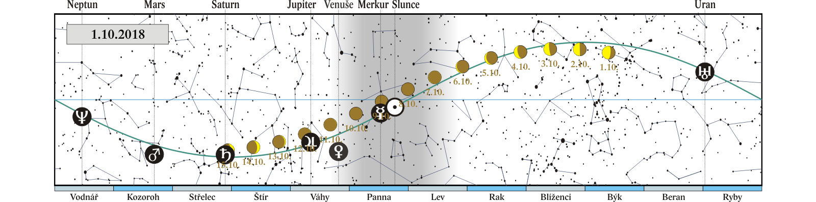 Měsíc v konjunkci s α Leo (Regulus 1,1° jižně; Měsíc v blízkosti Regulu pozorovatelný 6. 10. ráno nad východním obzorem) |