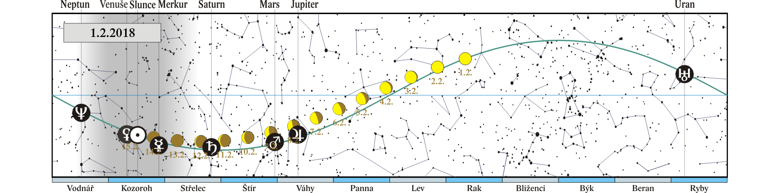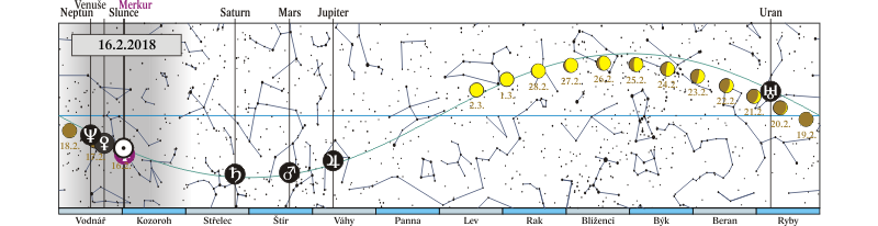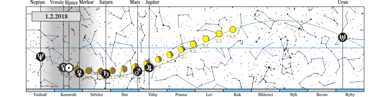 Měsíc v konjunkci s Jupiterem (Měsíc 3,7° severně; seskupení Měsíce, Jupiteru, Marsu, planetky (4) Vesta, hvězdy Antares a Saturnu na ranní obloze 7. – 12. 2.) |
