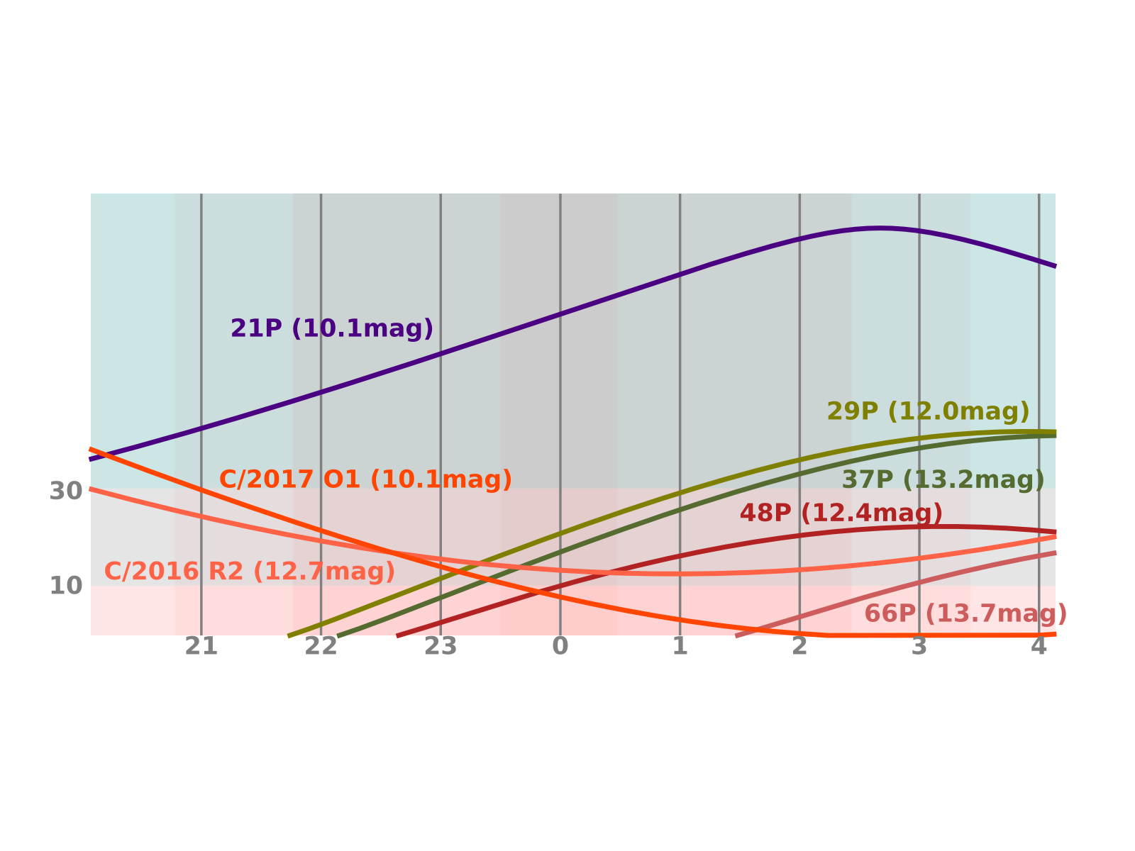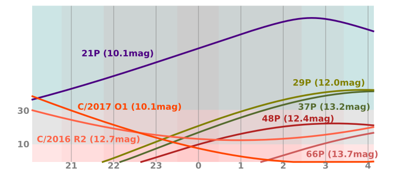 V červenci se již začne zvolna navracet noc a na obloze bude vysoko nad obzorem zářit prudce zjasňující kometa 21P/Giacobini-Zinner. Z 11 mag na začátku měsíce zjasní k 9 mag a na konci měsíce bude viditelná i malými triedry. Ze souhvězdí Labutě se bude zvolna přesouvat do Kefea. Kromě ní bude možno na obloze spatřit velice nízko nad jižním obzorem kometu 48P/Johnson. Ta bude mírně slabší 12 mag a nalezneme ji v souhvězdí Vodnáře. Vzdálenost od Slunce v perihelu u této komety díky gravitačnímu rušení Jupiteru v průběhu času osciluje mezi 2,3 a 2,0 AU. Právě přiblížení k této planetě na 0,603 AU v roce 2014 snížilo perihelovou vzdálenost k minimální hodnotě. Letos ji tak můžeme poprvé od objevu v roce 1949 pozorovat při větší aktivitě jádra. Jak moc se to projeví na jasnosti lze odhadnout jen přibližně.